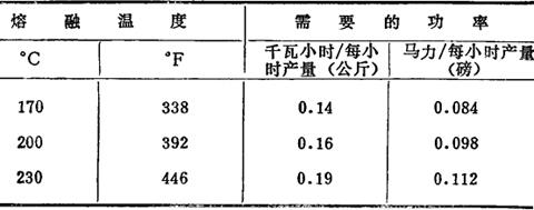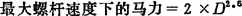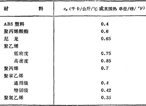 释义 | 概算 已经提出了各种经验规律,用以概略地确定所需的传动功率: (一)聚氯乙烯 0.15~0.2 千瓦小时/每小时产量(公斤) 或0.1~0.123 马力/每小时产量(磅) 聚烯烃 0.2~0.3 千瓦小时/每小时产量(公斤) 或0.123~0.2 马力/每小时产量(磅) 聚砜、聚碳酸酯 0.14~0.22 千瓦小时/每小时产量(公斤) 或0.096~0.134 马力/每小时产量(磅) (二) 式中,D=螺杆直径(时) (三)型材挤出 6~9 每小时产量(公斤)/千瓦小时 (10~15 每小时产量(磅)/马力) 混料 2~3 每小时产量(公斤)/千瓦小时 (3~5 每小时产量(磅)/马力) 高粘度物料(未增塑聚氯乙烯,ABS塑料,聚丙烯酸酯类等)5~6 每小时产量(公斤)/千瓦小时 (8~10每小时产量(磅)/马力) (四)低密度聚乙烯: 因此,在200℃(293F°)下挤塑90公斤/小时(200磅/时)需要 200×0.098马力=19.6马力 或90×0.16千瓦=14.4千瓦小时 (五)假设传动效率为80%,则所需最低功率为: Pm=YQwc,(T1-T2) 式中: Pm=最低功率(千瓦小时或马力) Qw=挤出机的挤出量(公斤/小时或磅/小时) cp=物料的平均比热容(千卡/公斤℃或英国热单位/磅/F。) T1=挤出料温度(℃或℉) T2=进料温度(℃或℉) Y=22.2×10-4(公制单位)=5.3×10-4(英制单位) 表3-4 挤出温度下的平均比热容 |