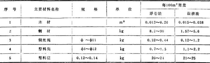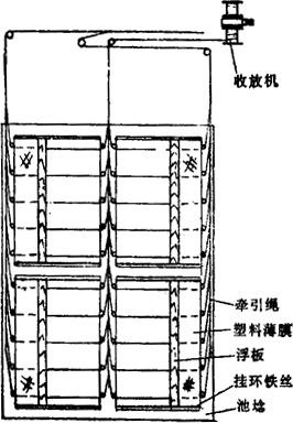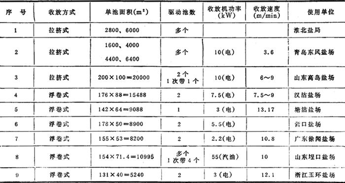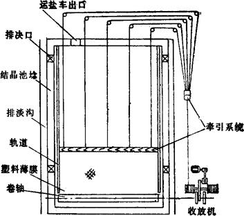 释义 | 概述 塑料薄膜苫盖结晶池,是结合我国海盐生产自然条件而创造的一种先进生产技术。降雨前,用塑料薄膜覆盖在结晶池卤水液面上,将雨水隔离在薄膜之上,并随时排出池外;雨后收起薄膜,恢复生产,从而保护盐层和卤水,减少降雨损失,对稳产、增产起到明显效果。薄膜收放有两种结构:拉挤式和浮卷式。拉挤式结构(图2-8-9)包括:薄膜、浮板、滑索、滑轮、牵引绳和驱动设备。经常是几个结晶池共同使用一个驱动设备。其结构简单,投资少;但用工多,薄膜使用寿命较短(3~4年),多用于面积较小的结晶池,一般不大于7000m2,但有的也达到20000m2。浮卷式结构(图2-8-10)包括:薄膜、浮卷轴、浮板、入轨器、滑轨、滑轮、牵引绳和收放机等。收放机主要型式有一机带两池和两机带一池两种,其结构比较复杂,投资高,但机械化程度高,薄膜使用寿命长(5~6年),适用于面积较大的结晶池(多在10000m2左右,有的已达到16000m2)。部分盐场塑苫设备性能见表2-8-7。塑苫材料消耗情况见表2-8-8。 图2-8-9 拉挤式塑苫结构 图2-8-10 浮卷式塑苫结构 表2-8-7 塑苫设备性能表 表2-8-8 塑苫主要材料消耗表 |