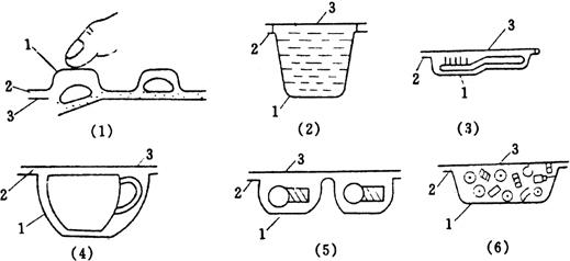 热成型-充填-封口机包装物品的形态如图2-8-1所示。其包装材料分为上下两层,通常下层(亦可为上层)采用热塑性片膜在加热状态成型为所需形状的容器,一般推荐使用厚度为0.15~0.3mm;上层(亦可为下层)采用铝箔、玻璃纸、复合薄膜等较薄的材料作为覆盖膜与容器热合,推荐厚度为0.02mm左右。