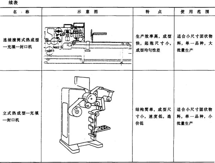 热成型-充填-封口机除了表2-8-1中所列的通用机型外,还有真空-充气和无菌化热成型-充填-封口包装机等机型。