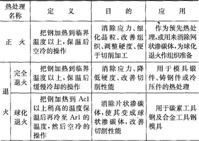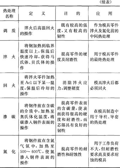 模具零件常用热处理工序有正火、退火、调质、淬火、回火、渗碳及氯化等。详细说明见表4.2-1。