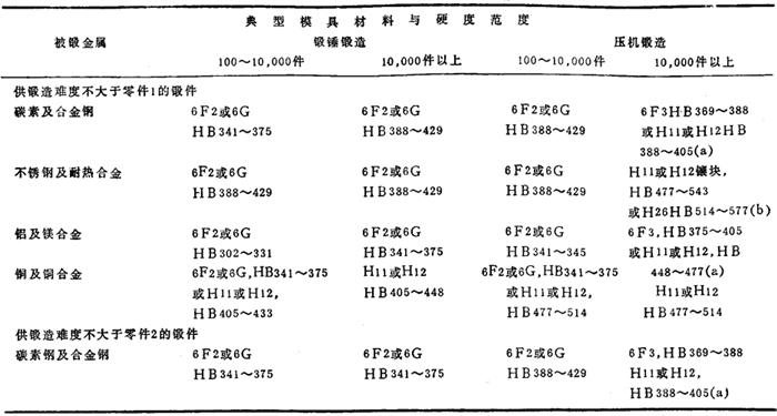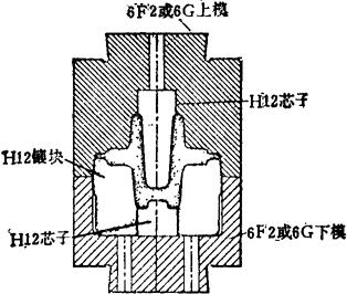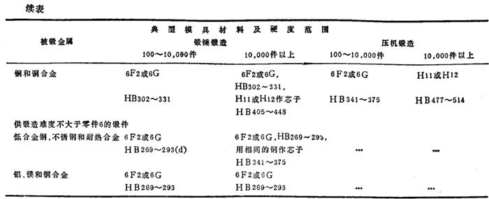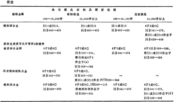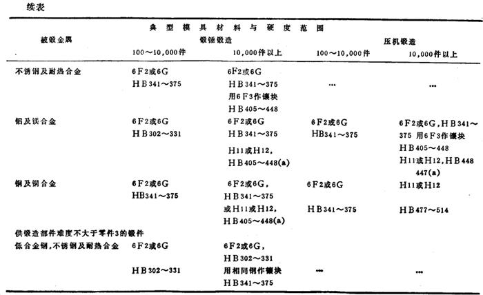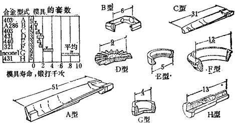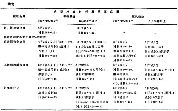 释义 | 模具材料 下面所论述的各种标准类型的工具钢的成分和性能,在本书内随处都可找到。通常用作预硬化模块的三种非标准低合金工具钢的名义成分见表72。 表72 作模块用的非标准工具钢的名义成分 注:(a)不论是AlSI或SAE都未曾对这些工具钢定过型号。 (b)选用。 适合于制作锻模的预硬化模块有一通用的成分和硬度范围。预硬化工具钢还可用来作小型模块、凹模镶块和切边工具。为便于机加工,各种预硬化的钢材也可在退火状态下应用;一旦机加工到所要求的轮廓,就采用标准工具钢通常采用的方法进行淬硬及精加工。 表73列出了市场上可以获得的五种预硬化模块的硬度范围。硬度范围采用布氏、洛氏及肖氏来表示。 表73 各种工具钢的预硬化模块的正常硬度范围 注:(a)模块硬度常用3000公斤试验时的布氏测试头直径表示。 (b)经淬火并回火的模块也可获得低硬度。 硬度通常用布氏硬度计测量,因为几乎所有模块对标准洛氏硬度计来说都显得太大了,还因为布氏硬度计对大型模块中可能存在的微小的组织上差异不太敏感。作布氏测量时,用硬质合金球在经过淬硬的模块上测量,因为硬质合金球在高硬度下,具有较好的抗变形特性,而且较钢球有更好的尺寸稳定性。 在许多锻造车间里,因为肖氏硬度计便于携带,硬度常用肖氏硬度计测量,然后换算到其它硬度值。 经预硬化的模块钢材常以硬度和适当名字来供采购用。供锻锤及热模锻压力机上用的模块和凹模镶块的典型工具钢及其布氏硬度见表74,在该表内,列出了图58所示加工难度渐增的6种假想锻件所推荐采用的模具材料,内容包括两种不同生产量及4种锻件材料。 图58 难度逐渐增加的6种假想锻件 图上尺寸均为英寸,化为mm时,需用图上尺寸乘25典型的模具材料和硬度范围见表74。 表74 供模块和凹模镶块用的典型工具钢 (锻件示例,见图58) 注:(a)推荐供大量生产用,例如50,000件。 (b)推荐供锻造高合金、耐热材料用,如镍基和钴基合金。 (c)推荐供1000~10,000件用。 (d)对于大批量生产——例如50,000件——推荐采用由硬度HB477~514的H11或H12工具钢制成一个实心块。 (e)对1,000件以上,推荐采用硬度HB341~375的同种材料的芯子。 表74所列的钢材与硬度是以最低的总成本(包括材料及制造费用)和避免断裂为基础来作推荐的,若用碳素钢或低合金钢来制造为数不太多的零件时,也可考虑用硬度较低的低合金工具钢。供锻造不锈钢及耐热合金钢,则需硬度略高的模具。 锻造铜合金时,较贵的H11和H12工具钢是合适的,因为铜合金在其最高锻造温度下具有较大的流动阻力,氧化铜是有腐蚀性的,而铜合金锻造用的模具常比钢锻件公差要求要小,这两种特性要求模具材料有高的耐磨性。 如表74所示,较高硬度适用于压床锻造,因为成型模具不受冲击。由于与热工作金属长时间相接触,压床锻模必须由在高温度下有较高的抗软化能力的钢制成。 和芯型镶块相结合的模具结构常用于锻造形状较复杂的锻件,图59系用于闭式模锻造汽车轴套的芯型镶块。 图59 汽车轴套典型模具设计 常推荐采用芯型镶块(未画剖面线部分)来锻造上述难度锻件(图中涂墨部分表示汽车轴套剖面)。在此情况下,上模部分的H12芯子与下模部分的一个很完整的H12镶块配合使用 图60系锻件的大小和形状对模具寿命的影响,图60的左上方的图表为在同一厂内用于锻造八种不同的不锈钢和耐热合金8种不同零件的锻模寿命数据。锻造合金类别不同,是影响模具寿命最主要因素,例如:在锻造431型不锈钢齿轮坯料中,3套模具的平均寿命仅为1,500件(D型),但用同种材料锻造比较简单的零件(H型)时,8套模具的平均寿命为8,000件。 图60 用6G钢模锻造8种不同的不锈钢和耐热合金锻件的模具寿命 模具硬度HB341~375。图的左上角给出了听示的模具套数的平均寿命及寿命范围。A型到H型大致按难度渐减顺序排列。尺寸均为英寸,化为mm时,要将图中尺寸乘以25 |
