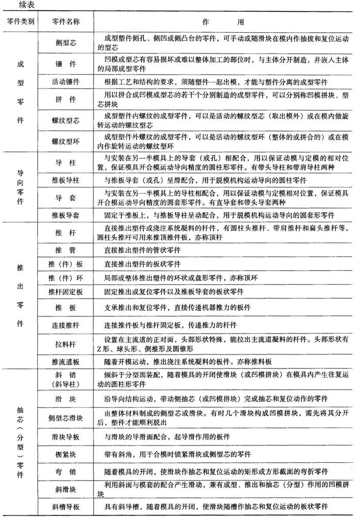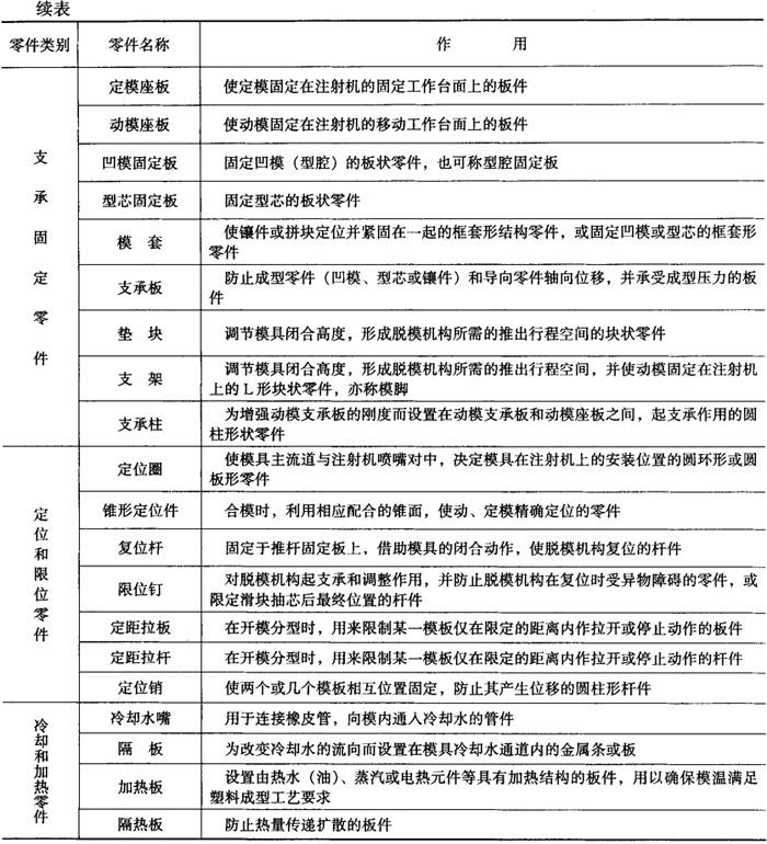 释义 | 模具组成 注塑模具的结构由注射机的类型和塑件的结构所决定。塑件结构由于其使用要求的不同而千变万化,导致注塑模具的结构形式多种多样。但把各种类型的注塑模具加以分析归纳,每套注塑模具可由若干职能部分组成,且它们在不同的注塑模具中起着相同的作用。根据模具中各部分作用的不同,一套注塑模具可以分成以下几个部分: (1)成型零部件赋予成型材料形状和尺寸的零件,即构成模腔的零件。通常由型芯、型腔、以及螺纹型芯或型环、镶块等组成。 (2)浇注系统注射机的喷嘴与模腔连接与过渡的通道。由主流道、分流道、浇口和冷料井组成。 (3)导向部件用来保证模具的动模和定模在模具闭合时的准确定位,有时也用来保证脱模机构的运动灵活平稳。通常由导柱和导套组成。 (4)脱模机构实现塑件脱模的装置。其结构形式很多,最常用的有推杆、推管和推板等脱模结构。 (5)分型抽芯机构对于有侧孔和侧凸凹的塑件,在塑件被推出之前,模具必须先进行侧向抽芯或分型,方能顺利脱模,广义来讲,它也是实现塑件脱模的装置。 (6)温度调节系统为了满足塑料成型工艺对模具温度的要求,需要温度调节系统对模具温度进行调节。 (7)排气系统为了将型腔内的气体排出,通常在模具的分型面上设置排气槽。对于小型塑件,因排气量不大,可直接利用分型面排气。许多模具的推杆或型芯与模板的配合间隙均可起到排气的作用,可不必另外开设排气槽。 (8)其它零部件包括支承、固定零件,定位和限位零件等。 注塑模具常用零件的名称及作用见表4-1。 表4-1 注塑模常用零件名称及作用 |