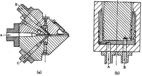 释义 | 模内复合机头 模内粘合法是多股(至少2股)料在机头定型段处汇合,并依次地粘合在一起后再离开口模。模内粘合的优点是便于进行厚薄调节,而且粘合强度大,所以此法被广泛采用。图13-6是模内粘合吹塑薄膜机头和平缝型机头结构示意图。 图13-6 模内复合共挤模 (a)三层平缝复合共挤模 (b)两层吹塑复合共挤模 |