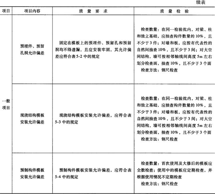 模板安装质量要求及检验见表5-1、表5-2、表5-3和表5-4。