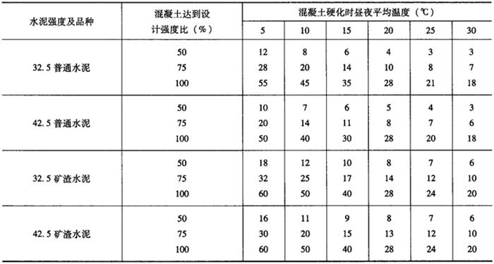如需要预先估计拆模时间,可参照温度、龄期对混凝土强度的影响,拆除承重模板的时间可参见表5-5。