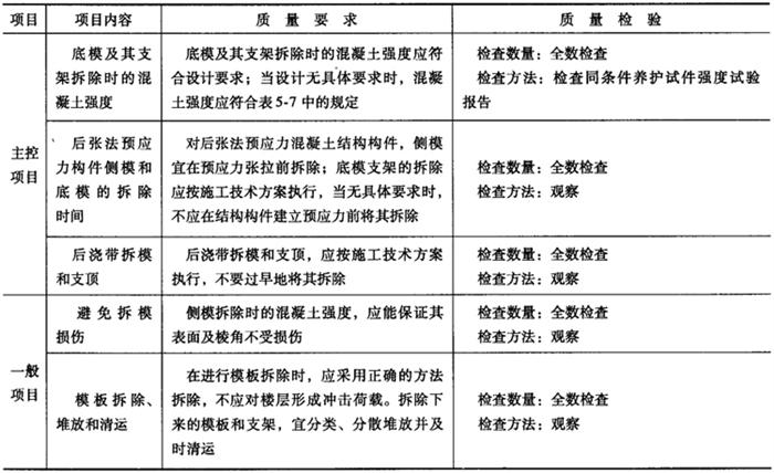 模板拆除的质量要求及检验见表5-6。底模拆除时的混凝土强度要求见表5-7。