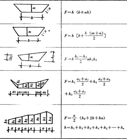释义 | 横截面计算法 表2-41 常用不同截面及其计算公式 计算土方量,按照计算的各截面积,根据相邻两截面间距离,计算出土方量,其计算公式如下: 式中 V-相邻两截面间土方量(m3); F1、F2-相邻两截面的填、挖方截面(m2); L-相邻两截面的距离(m)。 |