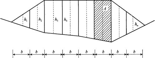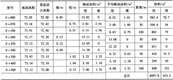 释义 | 横断面面积与土方计算 渠道纵横断面图绘制完成后,就可进行土方计算。 1.确定填挖断面 计算土方量之前,应绘制标准断面图。标准断面图既可直接绘在横断面图上,又可制成模片进行套绘。标准模片的制作是根据渠底设计宽度、深度和渠道内外坡比,在透明的聚酯薄膜上绘制成的。标准断面绘成后,即可将标准断面套在横断面图上。套绘方法是根据纵断面图上各里程桩的设计高程,在横断面图上表示出来,作一标记。然后将标准断面的渠底中点对准该标记,渠底线应与毫米纸的方格网线平行,这样即套绘完毕。地面线与设计断面线(标准断面线)所围成的面积即为挖方或填方面积,在地面线以上的部分为填方,在地面线以下的部分为挖方(图13-5)。 图13-5 套绘标准断面图 2.填挖横断面面积的量测 (1)积距法 如图13-6所示,按单位宽度b(通常用1m或2m)把横断面分成若干个梯形与三角形条块,每个条块的近似面积为其平均高度,hi乘以宽度b,即 Fi=hib 则横断面面积为 当b=1m时,则F在数值上等于各个小条块平均高度之和∑hi。 图13-6 积距法计算横断面面积 (2)坐标法 当要求量算精度较高时,其横断面面积计算一般采用解析法。先算得设计线与地面线所围成面积的各转点坐标(图13-7),按顺时针编号,则断面即可按下式计算。 式中 F——横断面面积; xi、yi——横断面各转折点相应坐标。 3.土方量计算 (1)相邻两断面填挖一致 若相邻两断面均为填方或挖方,且面积大小相近,则可假设两断面之间为一棱柱体,其体积计算可采用平均断面法,即相邻两断面的挖或填面积的平均值,按下式计算。 式中 F1、F2——相邻两断面挖方或填方的面积; F——平均值。 则两断面间的挖(填)土方量为: V=Fd 式中 d——相邻两断面之间的水平距离(m)。 若相邻两断面均为填方或挖方,而面积相差甚大,则与棱台更为接近。其计算公式为: 式中 图13-7 坐标法计算横断面面积 如表13-12所示,计算土方量时,是将纵断面图上各里程桩的地面高程、设计高程、填挖量及各断面的填挖方面积分别填入表内,然后求取相邻两断面挖方或填方面积的平均值,填入表内,平均断面面积乘以两断面间的水平距离即为挖方或填方量,分别填入表中相应栏内。 表13-12 土方量计算表 (2)相邻断面填挖不一致 如果相邻两断面的中心桩,其中一个为挖,另一个为填,则应先找出不填不挖的位置,该位置称为“零点”。如图13-8所示,设零点O到前一里程桩的距离为x,相邻两断面间的距离为d,挖土深度或填土高度分别为a、b,则 即 图13-8 确定零点桩位置的方法 |