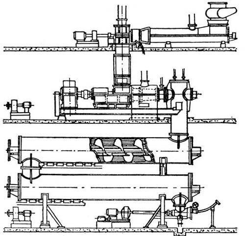 释义 | 横管连续蒸煮器 横管连续蒸煮器占地面小,占用空间也较少,操作简便,但结构略显复杂。 国内外多采用横管连续蒸煮器,进行草类纤维原料制浆。 图6-3-2 横管式连续蒸煮器 1.非本材纤维横管连续蒸煮器 (1)系统简介 本机为天津轻工机械厂引进瑞典Sunds Defibrator公司设计、制造、检验等专有技术生产的产品。由销鼓计量器、预蒸器、螺旋进料器、T型管、压力浸渍器、蒸煮管、卸拆器、排料阀等不同规格的单机组合而成,还配套国际先进水平的PLC内联锁逻辑控制系统,以保证生产的高度自动化和可靠性,其结构见图6-3-3。 图6-3-3 非木材纤维槽管连续蒸煮器示意图 本机适用于各种非木材(如蔗渣、稻麦草、棉秆、苇荻、竹片等)原料生产化学浆和化学机械浆,配用热磨机也适用于木片CTMP生产。 生产能力 化学浆:50~150t/d; 化学机械浆:50~200t/d。 (2)设备特点 非木材纤维横管连续蒸煮器的特点如下: ①生产的纸浆质量好、强度高、滤水性能好,易漂白。 ②收获率高,比间歇蒸煮约高5%。 ③节省热能、热负荷均匀。 ④厂房占地面积小,可考虑安装于半露天场所。 ⑤与先进的湿法备料配套,原料水分高达75%仍可正常运行。 ⑥排料可采用先进的冷喷放技术。 2.ZJL型横管连续蒸煮器 本设备主要用于稻麦草、蔗渣、芦苇、竹、龙须草等非木材植物纤维原料进行碱法或硫酸盐法制浆蒸煮。 设备主要技术性能(见表6-3-8)。 表6-3-8 主要技术性能 主要设备特征如下: (1)ZTL1横管连续蒸煮器的主要设备特征 表6-3-9ZTL1 横管连续蒸煮器的主要设备特征 (2)ZJL3横管连续蒸煮器的主要设备特征 ①刮板运输机:CQZ2611-6型,带宽800mm,水平长度29.272mm。油冷式电动滚筒:TDY型,功率7.5kW,线速度1.5m/s。 ②皮带运输机:CQZ2613-6型,带宽800mm,水平长10700mm。风冷式电动滚筒:QD80型,功率3kW,线速0.9m/s。 ③105m3料仓:设计容积105m3,有效容积70m3,外形尺寸18500×6150×9300mm。 ④链条刮板输送机:CQZ1718型,槽宽630mm,链轮节距700mm,线速度24m/min,配用电机JCH751,7kW,40r/min。 ⑤回草皮带机:CQ2615型,带宽500mm,水平长度13751mm,风冷式电动滚筒:QD-80型,线速度0.5m/s。 ⑥回料螺旋:Φ430×1808mm,螺距250mm。 ⑦转鼓计量器:转鼓Φ900×760mm,生产能力2~6t/h,配用电机JZB-52,1.5/1.67kW,1410/470r/min。 ⑧双辊混合机Φ500×3500mm,配用电机JTC-752,6.6kW,48r/min。 ⑨预压螺旋Φ350mm,压缩比1∶1,倾角60°,100r/min,配用电机Y-160-4,11kW,1460r/min。 ⑩进料螺旋Φ350/Φ240,压缩比1∶3,线速度50~90m/min,减速箱ZL65-4-2,配用电机75/25kW,1050/850 r/min。 ⑾气动止逆阀:气缸Φ250mm,活塞行程600mm,最大工作压力0.7kPa,止逆阀直径340mm,端面倾角20°。 ⑿蒸煮管2根Φ1100×10000mm,螺旋叶片Φ1036×350mm,配用电机JZS-61-1型,10/3.3kW,1410/470r/min。 ⒀翼式出料器:Φ580/377,配用电机Y160-6.11kW。 ⒁“O”型球阀Φ103mm-O。 ⒂喷放锅:ZTP型,容积80m3,Φ3350×13317mm,工作压力0.25MPa。 ⒃碱液贮存槽:40m3。 ⒄药液计量泵:ZBD-5/10 2台并联,1台备用电机JBS2-4,4.2kW。 3.60t/d横管连续蒸煮器主要设备介绍 (1)双辊计量器 双辊Φ980×900mm,每辊齿数8个,辊齿间隙总容积0.65m3,转速0.46~2.78r/min,配用电机5.5kW,1435r/min。 (2)双辊预浸渍机 喷液管Φ50mm,喷液孔直径Φ3mm,孔数20个,浸渍部分长4600×高1140mm,推料刮刀外径Φ850mm,螺距900mm,个数90个,辊转速30.5~122r/min,浸渍槽溶积6.4m3。 (3)预压螺旋 螺旋Φ350mm,螺距250mm。螺叶倾角45°,转速77、86、91、100、110、117、128r/min。(更换链轮变速)减速电机15kW,100r/min。 (4)螺旋进料器 螺旋全长1540mm,尾杆长203mm,压缩比1∶2,螺旋分4段: 第一段Φ406mm,螺距254mm,螺旋叶厚12mm。 第二段Φ406mm,螺距305mm,螺旋叶厚20mm。 第三段锥角5°46′41″,螺距292mm,螺旋叶厚33mm。 第四段锥角5°46′41″,螺距231m,螺旋叶厚40mm。 电机132kW,1485r/min,电磁滑差离合器调速范围300~1350r/min。 螺旋表面堆焊钨铬钴合金层厚3mm,螺旋转速20~90r/min,密封管内径Φ290mm,长180mm,壁厚20mm,(L=0.62D)。 防滑筋条12条,端面倾角45°。 筋条规格610×25.4×19mm。 (5)气动防反喷阀 阀径Φ400mm,活塞行程800mm,压缩空气压力588kPa(6kg/cm2)。 (6)蒸煮管 4根内径Φ1050mm,有效长度8900mm,壁厚12mm,管材质复合不锈钢板。 螺旋Φ900mm,螺距350mm,螺旋转速(r/min)。 第一管3.3~9.9或5.3~16.5; 第二管2.4~7.2或4.0~12.0; 第三管2.1~6.3或3.5~10.5; 第四管1.9~5.7或3.3~9.9。 (7)翼式出料器 出料口Φ710mm,转子翼片直径Φ580mm、4片,转速100r/min,附Φ45放料阀2个,电机22kW·1480r/min,0.18kW·980r/min。 (8)喷放锅 容积60m3,立式搅拌器转速110r/min,22kW·1450r/min。 碎浆机转子Φ845mm,翼片8个,转速400r/min,筛板孔径Φ10mm,厚度15mm。 |
