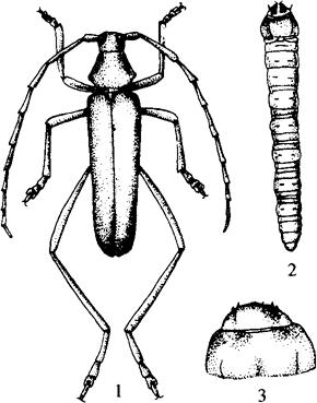 释义 | 橘光绿天牛 【学名】 Chelidonium citri Grressitt。 【别名】 光盾绿天牛、橘枝绿天牛。 【分布与为害】 分布湖南、海南、广东、广西、云南、福建、江西、四川、安徽等地。寄主有九里香、柑橘、柠檬、柚子等。幼虫蛀食枝条,并多次转枝为害,由小枝转大枝再入主干。 【形态特征】 成虫体长24~27毫米。体背面墨绿色,有光泽;腹面绿色,被银灰色茸毛。足和触角深蓝色或黑紫色,跗节黑色。头部刻点细密,额区有1中沟伸向头顶。触角第五至十节端部各有1根尖刺。雄虫触角略长于体。前胸长和宽略相等,侧刺突略钝。鞘翅上满布小点和皱纹。卵长约4.7毫米,宽约3.5毫米。长扁圆形,黄绿色。老熟幼虫长46~51毫米,淡黄色,体表具褐色分布不均匀的毛。前胸背前方有2块褐色背板,其前缘左右两侧亦各有1小硬板。前胸背后缘有1长形横置稍厚的皮质硬块,乳白至灰白色。硬块之下有1褐色横带纹。腹末肛门开口呈“Y”字形(图9-94)。蛹长19~25毫米,黄色。翅芽伸达腹面第二节,背面具褐色刺毛。 图9-94 橘光绿天牛 1.成虫 2.幼虫 3.幼虫头和前胸背面 【生活习性】 在广东、福建1年发生1代,少数2年1代。以幼虫越冬。翌年4月幼虫进入预蛹期。预蛹期3~5天。蛹期23~25天。4月至5月初开始出现成虫,5月下旬至6月中旬成虫盛发,至8月初尚可见成虫。成虫寿命15~30天,卵期18天。5月下旬幼虫孵化,6月中旬至7月上旬盛孵。幼虫期290~320天。1月间幼虫开始休眠。 成虫无趋光性。晴天交尾,当天产卵,产卵期6天。每日产3~5粒,多产于树枝末端嫩绿的细枝分叉口或叶柄与嫩枝的分叉口,每处1粒。幼虫孵出后,经6~7天,蛀入枝条,向枝顶端蛀食。顶枝枯死后,再向下由小枝蛀入大枝,再由大枝蛀入主干。幼虫为害期180~200天。蛀道上,每隔一定距离有一向外排泄孔,最下面1孔下方为幼虫潜居处。蛀道末端上方22~26厘米处为蛹室,上、下塞有木屑,两端内壁有磁质分泌物形成的凹面,羽化孔位于蛹室下方10厘米左右处。 【防治方法】 (1)人工捕杀幼虫。用小刀或钢丝从树干最下面1个蛀孔刺入勾杀幼虫。 (2)药剂防治。幼虫盛孵期(6月下旬至7月上旬)喷25%园科3号200倍液,或40%氧化乐果1000倍液。 |