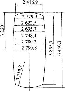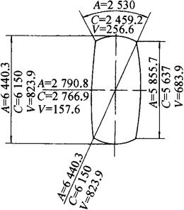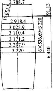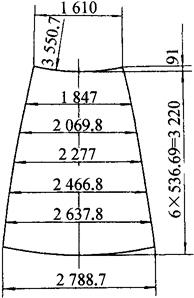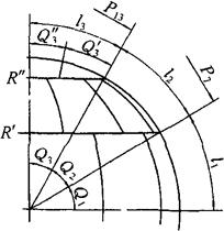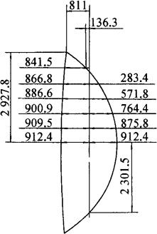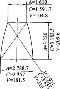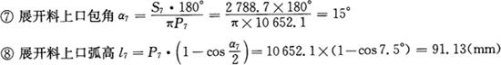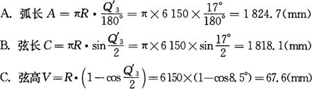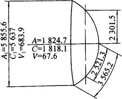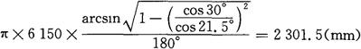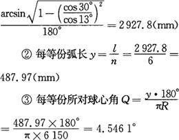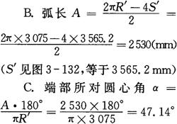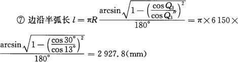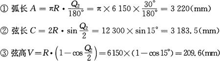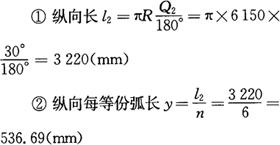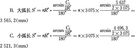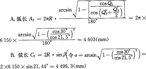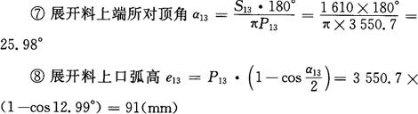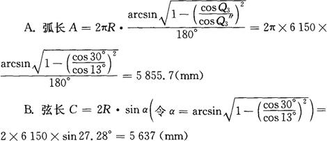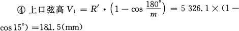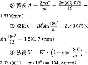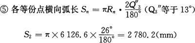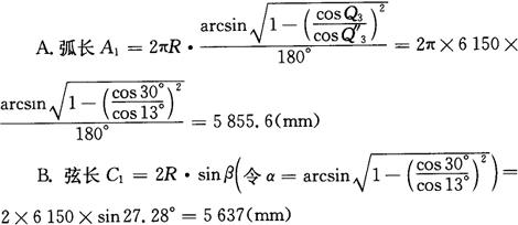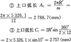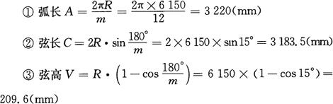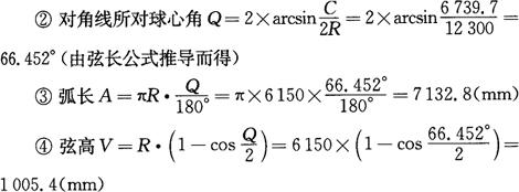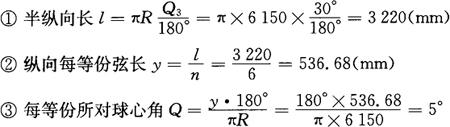 释义 | 橘瓣球壳瓣片料计算 图3-123 立体图 球形贮罐按分瓣方式分为橘瓣式、足球瓣式、混合瓣式等几种,常用的为橘瓣式,如图3-124所示。其特点是球壳拼装焊缝较规则,施工简便,加快组焊进度,便于采用自动焊。由于分块分带对称,装配应力及焊接内应力较均匀。下面介绍其计算方法。 图3-124 1000m3橘瓣球体 计算原理见图3-125。 图3-125 计算原理图 1.赤道带 (1)展开料计算方法(见图3-125和图3-126) 图3-126 赤道带展开图 ①半纵向长 ②纵向每等份弧长 ③每等份所对球心角 ④每等份点处截圆半径Rn=R·cosnQ′1 R2=6150×cos5°=6126.6(mm) 同理得: R1=6150mm,R3=6056.6mm,R4=5940.4mm R5=5779.1mm,R6=5573.8mm,R7=5320.1mm。 ⑤各等份点横向弧长 同理得: S1=3220mm,S3=3171.2mm,S4=3110.4mm, S5=3025.9mm,S6=2918.4mm,S7=2788.7mm。 ⑥上口展开半径P7=R·tan(Q2+Q3)=6150×tan60°=10652.1(mm) (2)成形后尺寸计算方法(见图3-127) 图3-127 赤道带成形后尺寸 1)端口尺寸 ①上口截圆半径R′=R·cosQ1=6150×cos30°=5326.1(mm) 2)纵向尺寸 ②弦长C2=2R·sinQ1=12300×sin30°=6150(mm) ③弦高V2=R·(1-cosQ1)=6150×(1-cos30°)=823.9(mm) 3)对角线尺寸 4)中横向尺寸 式中 Q1——赤道带半球心角; Q2、Q3——分别为温带和极带球心角; R——球内半径; m——赤道带瓜瓣数,本例m=12 2.温带 (1)展开料计算方法(见图3-127和图3-128) 图3-128 温带展开图 ④每等份点处截圆半径Rn=R·cos(Q′1+nQ′2) R7=6150×cos30°=5326.1(mm) R8=6150×cos35°=5037.8(mm) 同理得: R9=4711.2mm,R10=4348.7mm,R11=3953mm,R12=3527.5mm,R13=3075mm。 ⑤各等份点横向弧长 同理得: S8=2637.8mm,S9=2466.8mm,S10=2277mm, S11=2069.8mm,S12=1847mm,S13=1610mm。 ⑥上口展开半径P13=R·tanQ3=6150×tan30°=3550.7(mm) (2)成形后尺寸计算方法(见图3-129) 图3-129 温带成形后尺寸 1)上端口尺寸 ①截圆半径R″=R·cos(Q1+Q2)=6150×cos60°=3075(mm) 2)下端口尺寸 同赤道带端口尺寸。 3)纵向尺寸 4)对角线尺寸 图3-130 对角线弦长计算原理图 ②对角线所对球心角 3.极板 (1)中央板(见图3-131) 图3-131 极带中央板 1)展开料计算方法 ④各等份点处截圆半径Rn=R·cosnQ R2=6150×cos5°=6126.6(mm) 同理得: R1=6150mm,R3=6056.6mm,R4=5940.45mm, R5=5779mm,R6=5573.8mm,R5=5326mm。 同理得: S1=2790.8mm,S3=2748.4mm,S4=2695.7mm, S5=2622.5mm,S6=2529.3mm,S7=2416.9mm。 ⑥端口展开半径P13=R·tanQ3=6150×tan30°=3550.7(mm) 2)极带中央板成形后尺寸计算方法(见图3-132) 图3-132 极板中央板成形后尺寸 ①端口尺寸: A.极板截圆半径R′=R·sinQ3=6150×sin30°=3075(mm) ②两侧角部间纵向尺寸 C.弦高V=R·(1-cosα)=6150×(1-cos27.28°)=683.9(mm) ③中横向尺寸: B.弦长C=2R·sinQ3″=2×6150×sin13°=2766.9(mm) C.弦高V=R·(1-cosQ3″)=6150×(1-cos13°)=157.6(mn) ④对角线(纵中线)尺寸: B.弦长C=2R·sinQ3=12300×sin30°=6150(mm) C.弦高V=R·(1-cosQ3)=6150×(1-cos30°)=823.9(mm) (2)边板(见图3-133) 图3-133 极带边板 1)边板左部分 ④每等份点所处截圆半径Rn=R·cosQn R2=6150×cos4.5461° =6130.65(mm) 同理得: R1=6150mm,R3=6072.73mm,R4=5976.6mm,R5=5842.85mm,R6=5672.35mm,R7=5466.15mm。 同理得: S1=912.4mm,S3=900.9mm,S4=886.6mm, S5=866.8mm,S6=841.5mm,S7=811mm。 2)边板右部分 ②每等份弧长y(同边板左部分的计算)。 ③每等份所对球心角Q(同边板左部分的计算)。 ④各等份点所处纬圆半径Rn(同边板左部分的计算)。 ⑤各横向弧在其截圆上的圆心角λn(左部分皆为8.5°,而右部分各异)。 式中 Q——中线一等份所对球心角,从边板左部分已知为4.5461°; 同理得: λ3=7.212°,λ4=5.482°,λ5=2.779°, λ6=-1.376°,λ7=-8.5° ⑥各等份点横向弧长 同理得: S2=875.8mm,S3=764.4mm,S4=571.8mm, S5=283.4mm,S6=136.3mm,S7=811mm。 3)极板边板成形后尺寸(见图3-134) 图3-134 极板边板成形后尺寸 ①左部分纵向尺寸 C.弦高V1=R·(1-cosβ)=6150×(1-cos27.276°)=683.9(mm) ②右部分纵向尺寸 C.弦高V2=R·(1-cosβ)=6150×(1-cos21.44°)=425.6(mm) ③横中线尺寸 ④右部分大小弧长 A.极板的截圆半径R″=R·sinQ3=6150×sin30°=3075(mm) |
