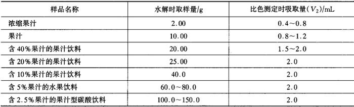 释义 | 橙、柑、橘汁及其饮料中果汁含量的测定(摘自GB/T16771) (一)范围 本标准规定了橙、柑、橘汁及其饮料中钾、总磷、氨基酸态氮、L-脯氨酸、总D-异柠檬酸、总黄酮6种组分的测定方法和用6种组分的实测值计算(推导)果汁含量的方法。 本标准适用于判定橙、柑、橘浓缩汁和果汁,以及果汁含量不低于2.5%的橙、柑、橘汁饮料。 (二)定义 1.浓缩汁、果汁及其饮料 定义同GB10789。 2.标准值 根据不同品种、不同产区、不同采收期、不同加工工艺、不同贮存期橙、柑、橘果汁及由其浓缩汁复原的果汁中可溶性固形物含量和6种组分实测值的分布状态,经数理统计确定的合理数值。 3.权值 根据6种组分实测值变异系数的大小而确定的某种组分在总体中所占的比例。 (三)方法提要 (1)按本标准规定的方法测定样品中6种组分。 (2)将6种组分的实测值分别与各自标准值的比值合理修正后,乘以相应的修正权值,逐项相加求得样品中的果汁含量。 (四)橙、柑、橘汁及其混合果汁的标准值和权值 1.可溶性固形物的标准值 20℃时,用折光计测定(不校正酸度),橙、柑、橘汁及其混合果汁可溶性固形物(加糖除外)的标准值,以不低于10.0%计。 2.6种组分的标准值和权值 6种组分的标准值和权值见表5-3-1。 表5-3-1 注:如标签上未标明橙汁或柑、橘汁时,以混合果汁计算。 (五)测定方法 1.可溶性固形物 按GB/T12143.1规定的方法测定。 2.钾 按附录A(标准的附录)测定。 3.总磷 按附录B(标准的附录)测定。 4.氨基酸态氮 按GB/T12143.2规定的方法测定。测定结果的单位以mg/kg表述。 5.L-脯氨酸 按附录C(标准的附录)测定。 6.总D-异柠檬酸 按附录D(标准的附录)测定。 7.总黄酮 按附录E(标准的附录)测定。 (六)果汁含量计算公式 橙、柑、橘汁及其饮料中果汁含量按式(1)计算: 式中 y——果汁含量,% xi(1~6)——样品中相应的钾、总磷、氨基酸态氮、L-脯氨酸、总D-异柠檬酸、总黄酮含量的实测值,mg/kg Xi(1~6)——相应的钾、总磷、氨基酸态氮、L-脯氨酸、总D-异柠檬酸、总黄酮的标准值,mg/kg Ri(1~6)——相应的钾、总磷、氨基酸态氮、L-脯氨酸、总D-异柠檬酸、总黄酮的权值。 (七)异常数据的修正原则 1.当 式中 y′——修正后的果汁含量,%