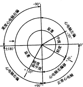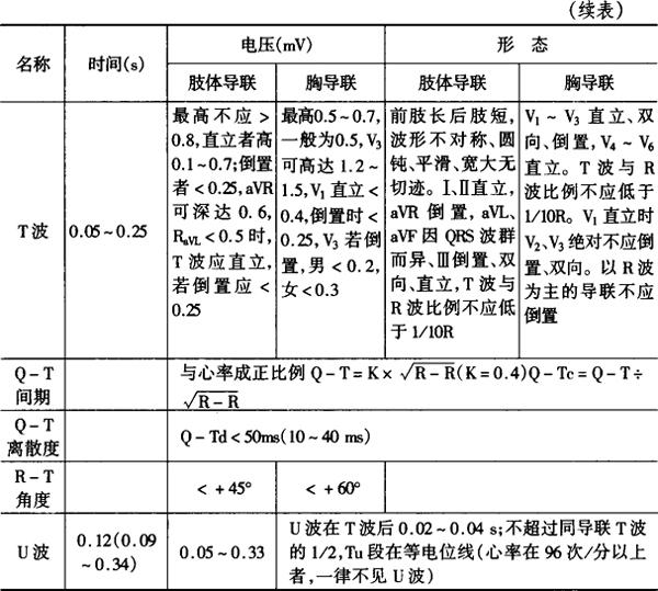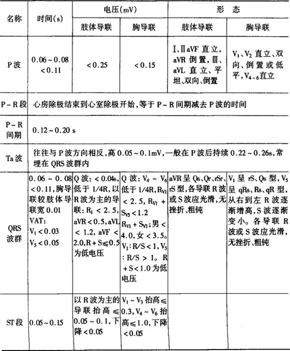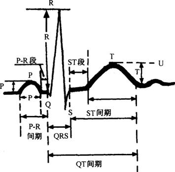 释义 | 正常心电图 1.心电图各波段的命名和测量 (1)各波群的命名与生理意义(图7-1) 图7-1 典型心电图图解 ①P波:为心电图曲线上第一个波,称P波,是左、右心房除极波。 ②Ta波:为心房复极波,一般埋藏在QRS波群之内。 ③QRS波群:为心电图曲线上第二个波群,称为QRS波群,是心室除极波。QRS波群中第一个向下波称Q波,其后第一个向上波称R波,若有第二个向上波则称为R′波,R波之后第一个向下波称为S波,若有第二个向下波则称为S′波。若只有一个向下波称为QS波。QRS波群振幅≤4mm的用英文小写字母q、r或s表示,波幅≥5mm的则用英文大写字母Q、R、S表示。 ④T波:为心电图曲线上第三个波,代表心室复极波。 ⑤U波:有时在T波之后可出现一个波即为U波,一般认为是浦肯野纤维复极波。 (2)间期的命名和生理意义 ①P-R间期:从P波的起点到QRS波群开始之间距离的时间,代表激动从窦房结发出,经心房、房室交界区、希氏束到达心室的传导时间。 ②P-R段:从P波结束到QRS波群起始之间的距离,是心房除极结束到心室除极开始的时间(即为P-R间期时间减去P波时间)。 ③QRS波时间:从QRS波群开始至终点,为激动在心室的传导时间。 ④ST段:为QRS波群终点到T波开始的一段,代表心室除极完毕到复极早期的时间。 ⑤Q-T间期:从QRS波开始到T波终点的时间,代表心室除极和复极过程所需要的时间。 (3)心电图测量方法(图7-2) 图7-2 心电图测量方法 ⑥心电图上时间与电压计算:一般心电图在描记时走纸速度为25mm/s,定标为10mm。心电图图纸上每一小方格的高、宽均为1mm,高度代表电压,1mm=0.1mV,宽度代表时间,1mm=0.04s。如果走纸速度和电压有调整,必须另加注明。 ⑦测量方法 a.电压测量:直立波(正波),从基线上缘垂直测量到波的顶端,即为直立波的电压。向下波(负波),从基线下缘垂直测量到波的最低点,即为向下波的电压。各波的总和为正负波的绝对值相加。 b.时间测量:各波的宽度即为各波的时间,从离开基线之点起到各波回到水平线上的间距,为该波的时间。 2.波、段、间期的正常范围:成人心电图各波、段、间期的正常范围见表7-5。正常P-R间期最高限度见表7-6。 表7-5 成人心电图上各波、段、间期的正常范围 表7-6 成人P-R间期正常最高限度 3.心电轴:心电轴是指心室在除极过程中,QRS波群在额面上各瞬间向量之和。 (1)心电轴偏移的分类:心电轴偏移的分类如图7-3所示。 图7-3 心电图偏移的分类 (2)心电轴偏移计算法 ①目测法:根据肢体导联Ⅰ和Ⅲ的QRS方向,可以粗略估计心电轴的偏移。 a.正常心电轴:QRS波群在Ⅰ导联中的主波向上或双向,Ⅲ导联中主波向上或双向,Ⅱ导联中向上波为主。 b.心电轴偏右:QRS波群在Ⅰ导联中主波向下,Ⅲ导联中主 c.心电轴偏左:QRS波群在Ⅰ导联中主波向上,Ⅲ导联中主波向下。 d.心电轴极度偏右:QRS波群在Ⅰ、Ⅱ、Ⅲ导联中的主波均向下,呈SⅠ、SⅡ、SⅢ型。 ②三角系统法(图7-4):以Ⅰ导联的QRS波群的代数和,点于三角形的Ⅰ边上,从此点做一条垂直线。以Ⅱ导联QRS波群的代数和,点于三角形的Ⅲ边上,从此点做一垂直线。与上条垂直线的相交点,通过相交点与三角形中点的连线,即为QRS波群的平均电轴方向。 图7-4 三角系统法测定心电轴 另外,心电轴还可以根据Ⅰ、Ⅲ导联QRS波群的代数和查表求得。 (3)临床意义 ①心电轴左偏 a.生理情况:如肥胖、妊娠等。 b.病理情况:见于各种原因所致的左室肥厚、完全性左束支传导阻滞、左前分支传导阻滞和下壁心肌梗死等。 ②心电轴右偏 a.生理情况:如瘦长体形者或婴儿等。 b.病理情况:各种原因所致的右室肥厚、右束支传导阻滞、左后分支传导阻滞和肺气肿等。 4.心率的计算方法 (1)计算方法 ①测量P-P或R-R间隔的时间,若心律不齐时,连续测量6~10个P-P或R-R间期,求其平均值除以60,即:心率(bmp)=60/P-P或R-R(s)。 ②数P-P或R-R之间的小格数除1500,即:心率(bmp)=1500/P-P或R-R(小格数)。 ③计算连续6s距离内的P或R波数(起点的一个P或R波不计算在内)乘10,即可得心房率或心室率(bmp)。 ④根据P-P或R-R间期的时间(s)或格数,查表即得心率。 (2)临床意义 ①成人:心率的正常范围为窦性心律60~100次/分,若低于60次/分,称为窦性心动过缓;若超过100次/分,称为窦性心动过速。 ②儿童:在婴儿和幼儿中,心率往往较成年人为高。所以,一般说来窦性频率是随着年龄的增加而逐渐减慢的。下列是各年龄组的心率分布情况。心率高于上限为窦性心动过速,反之为窦性心动过缓。 初生婴儿:110~150次/分; 2岁左右:85~125次/分; 4岁左右:75~115次/分; 6岁左右:65~105次/分; 6岁以上:60~100次/分。 5.分析心电图的一般步骤 (1)各导联顺序排列,检查导联有无错误,阻尼是否适宜,走纸速度和定标电压是否按常规标准描记,个别导联电压有无减半。 (2)找出P波,根据P波的形态和方向以及P波与QRS波群的关系确定基本心律。 (3)测量P-P或R-R间期,确定心率,如房率与室率不一致时,应分别计算。 (4)观察P波,QRS波群的形态、振幅,测量时间。 (5)测量P-R间期、Q-T间期、Q-Tc间期、V1与V5室壁激动时间,确定心电位和心电轴等。 (6)注意ST段有无移位,以及移位的程度和形态。 (7)注意U波振幅和形态,以及Q-U间期。 分析结束,再仔细检查一遍有无错误。 |