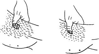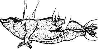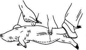 释义 | 母猪卵巢摘除术 15千克以内的小母猪一般采用小挑法;15千克以上的一般采用大挑法。 (1)小挑法 手术前应禁食一顿。 保定:用左手抓住猪的左后肢,将猪提起,左右摇动几次,使猪右侧卧地,背向术者。术者以右脚踩住猪的颈部,将左后肢向右伸直,伸腿的前面向上,左脚踩住猪的左后肢趾部,以骑马式姿势进行手术(图2-10)。 图2-10 小母猪保定及切口部位 手术部位:在左侧下腹部,左侧乳头外侧约2~3厘米,与右侧髋结节的相对处。一般多位于左侧倒数第二个乳头的外侧2~3厘米处。 手术方法:术部常规消毒,术者右手将术部皮肤稍向腹侧牵引,左手中指抵于右侧髋结节,拇指用力按压在术部稍外侧,两指成一直线,压的越紧离卵巢越近,手术易于成功。右手持手术刀,用拇指、中指与食指控制刀刃的深度,用刀尖垂直切开皮肤成0.5~1厘米的纵形切口,然后用刀柄呈45度角斜向前方伸入切口内,轻轻左右拨动,并捣破腹膜,在猪嚎叫时,随腹压的升高子宫角也随着涌出(图2-11)。若一次不出来,左手拇指一定要压紧,刀柄在腹腔内作弧形滑动,随着嚎叫和腹压剧升而使子宫角涌出。右手捏住脱出的子宫角及卵巢,轻轻向外拉,然后用左右手的拇指、食指轮换向外拉,左右手的其他三指交换压迫腹壁切口。当两侧卵巢和子宫全部拉出后,用手指挫断子宫体,将两侧卵巢和子宫一同除去。切口涂碘酊,提起猪的后肢,稍摆动一下,即放开让其自由活动。 图2-11 去势时子宫及卵巢自切口涌出 (2)大挑法 手术前应检查母猪是否发情(阴门红肿),发情母猪卵巢、子宫充血,易引起出血,不宜手术。术前应禁饲一顿。 保定:右侧横卧保定,使背部向着术者,助手保定头部和两后肢,而后牵引伸直。 手术方法:如图2-12。术部应选在髋结节前下方5~10厘米处,术部剪毛消毒。术者右手持刀将皮肤切开3~5厘米长的弧形创口,以右手食指尖端钝性分离腹壁肌肉,然后向背部方向戳破腹膜,伸入腹腔,在骨盆入口顶端内侧左右摇动食指,探索卵巢。摸到卵巢后,以食指尖端钩住卵巢,沿腹壁向外将其钩出。同法钩出另侧卵巢,分别结扎后切除。也可将子宫全部导出后,两侧卵巢结扎摘除后送回腹腔。最后,在切口上撒布磺胺粉并缝合创口。 图2-12 大挑法 |