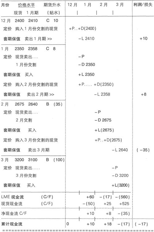 释义 | 每月对年度供应合约进行的套期保值 前面的例子涉及的都是单一的操作,表明了如何进行套期保值操作及如何在期货升水或期货贴水的市场状况下获利。年度合约看起来要复杂一点,但实际上它们也是由一系列的单独的操作所构成的。 例A 目的 对年度合约中的每月定价操作进行概述。 假设条件 现货购买定价比现货销售定价早一个月,每月都单独进行套期保值。 例 对例子的评述 每月都对以一个月为间隔的现货定价进行套期保值,只要全年保持期货升水,套期保值就会一直继续下去。但如果市场远期结构从期货升水转变为期货贴水,则剩余月份中的远期套期保值操作就不会那么有吸引力了。 每月现货和LME头寸大致匹配后加上或减去期货升水、期货贴水和交易费用计算产生的现金流。因为LME的卖出套期保值和买入套期保值头寸的交割期是同一个月,所以每月会出现两份套期保值佣金。 例B 目的 说明在长期合约中,如果约定在每月发运货物并定价,当期货升水转变为期货贴水时,所产生的现金流及其影响。 假设条件 现货购买定价比现货销售定价早一个月,每月进行套期保值,现货金属到达的时间同现货销售交割的时间相同,购买现货金属时在货物运达时付款,销售于交割时付款(背对背)。每月对现货定价,情况如下所示: 各月期差: 12月-1月10C,1月-2月8C期货升水; 2月-3月(35)B,3月-4月(100)B期货贴水。 需要注意的是:虽然这个例子仅仅说明了3个月的情况,但其包含的概念和作用与一个完整的年度合约是相同的。 例 对例子的评述 通过对第3个月期货升水的套期保值,前两个月期货升水的获益可以弥补期货贴水带来的损失。现货部分有利的现金流补偿了除期货贴水所引起的净损失之外的在LME不利的现金流。如果套期保值者在2月份决定通过停止对LME远期的套期保值而摆脱期货贴水带来的损失,从事后的结果来看,好像是交易者(消费者)获取了巨大的利润。其实这是一种错误的想法,因为在3月份一旦市场价格跌至2200,交易者在现货方面出现的损失将是475/公吨。反之,如果交易者在2月份进行了套期保值,此后市场下跌至2200(而不是升至3200),则3月份有利的现金流(+440,未显示)将在很大程度上对冲现货部分的不利现金流(-475,未显示),但期货贴水条件下套期保值操作的成本(费用)(-35,如所示)仍然存在。防范此种风险的方法将在第8.11节例C中予以说明。在例C中,使用了相同的价格假设,但加入了用于防范12月份的期货升水变化的最早的锁定操作。 |