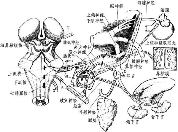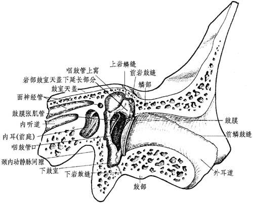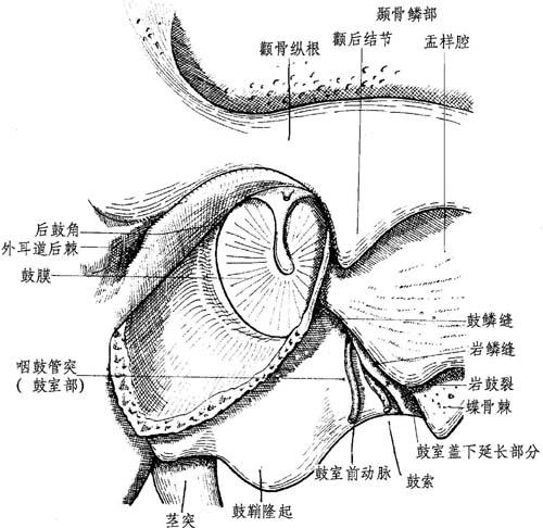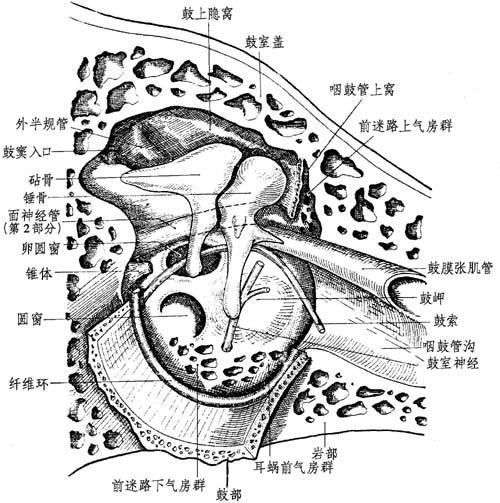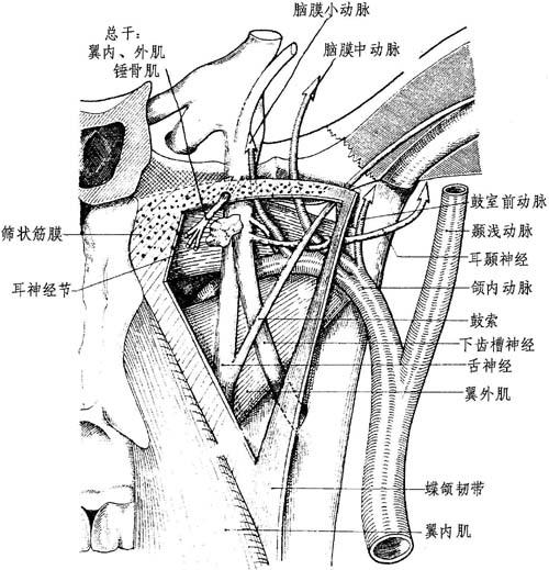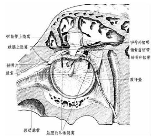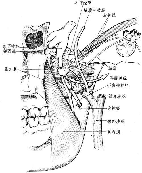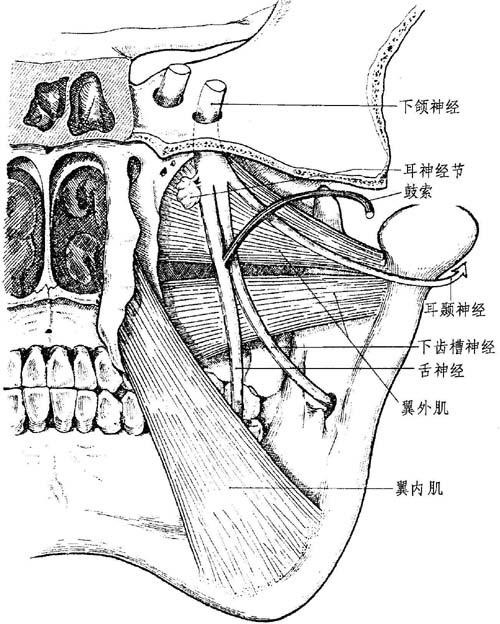 释义 | 毗邻关系 一、在后管里(图13-3) 图13-3 鼓索、副交感束(径) 伴同茎乳动脉之支,一条小动脉,鼓索通过骨管中间段而对应:在外方的乳突骨壳;位于外耳道后部。在前方,行进中靠近鼓室的后壁;在后、内方,行向面神经第3部分以远处。 二、在鼓室内(图13-4,13-5,13-6) 图13-4 鼓室径路部分 图13-5 与鼓室黏膜皱襞的关系 图13-6 出口 (一)进入孔(入口) 垂直裂隙位于:①鼓室后壁上的中1/3处;②水平段通过鼓膜脐部。 鼓索对应: (1)外侧:形成鼓沟的鼓室处。与鼓膜附着并和鼓沟相接触。 (2)内侧:藏有镫骨肌的锥隆起并由鼓索嵴分隔。 (3)上方:于鼓窦入口槛和砧骨窝处,并由面神经隐窝与二者分隔。 (4)下方:后岩鼓缝,极薄,降至鼓索内方。 (二)穿经鼓室部分 永远伴同来自茎乳动脉的随行支。按其位置与锤骨颈的关系,可分为3部分: 1.在锤骨颈后方:在鼓膜锤骨黏膜后皱襞内(TrÖItsch皱襞)。 内方,鼓索交叉砧骨降支的外面。镫骨及卵圆窗都在一个水平位。 外方,神经顺着骨隆起并或很明显,易发现;或为骨隆起而被遮盖。 鼓索有碍进卵圆窗的操作,且通常斜向下方。 2.在锤骨颈外:紧挨锤骨颈内面通过鼓室黏膜。 (1)在外方:鼓索恰于锤骨颈中间到松弛部。 (2)在下方:与鼓膜张肌腱插入点处相接。 (3)在内方:与面神经管钝突留有距离,在管的水平段到鼓室内壁上方。 3 .在锤骨颈前方:在鼓膜锤骨前黏膜皱襞增厚部内。 伴随:①其外方的,同一水平面上,到同一黏膜皱襞内:锤骨前突延伸到锤骨前韧带。此韧带和鼓索滑入前鼓角内缘的骨沟——锤骨沟。②内方离开匙状突,到鼓室的内壁。 (三)出孔(出口) 位于鼓室前壁的上外方,靠近三个裂的交叉出口:①鼓鳞;②岩鼓;③前岩鼓口。 (四)界限 上方,鼓室盖的下延长部的下外缘;在下方为锤骨沟。 由岩骨嵴处分成两个副孔,内为鼓索孔,外为锤骨前韧带和前鼓室动脉。 三、在前管内 管壁(岩鼓裂):①在下方,为鼓室的咽鼓管隆起上缘;②在上方,为鼓室盖下延长部分的下内面。 通过管中间:①在下:咽鼓管骨段、鼓膜张肌管,直接附于咽鼓管上部分。②在外:平行前管走行的薄细小管,在此经过,有锤骨前韧带和前鼓室动脉。 盂样腔绕经岩鼓缝(Glasser),在内方分成两部分,行向鼓室盖的下延长部分。 四、在颅底下方 (一)出口(图13-7) 图13-7 露出部分:Glaser裂 长管:延续出口极近蝶骨棘。鼓索直接依附在蝶骨棘内面。 短管:提前出口在岩鼓裂处。鼓索则进入盂样腔,并在其间与鼓室盖下延长部分的下面、颞骨鳞部水平部分、有时蝶骨大翼的后角等3者有关系。 在此区域内,鼓索是游离的或在小骨细管内,形成一明显的出口。 提前出口者,关系至为重要:翼间筋膜插入岩鼓裂的全长。鼓索恰好滑入筋膜的外侧,前鼓室动脉的内侧。 (二)翼状区(图13-8,13-9,13-10) 图13-8 翼间区:外壁(内面观) 图13-9 翼间区:外壁(后面观) 图13-10 翼间区:内壁及血管神经分布 鼓索神经位于本区的后上部。 1 .与四壁的关系 (1)内侧:翼间筋膜连成片,附着在上面,在岩鼓缝的前方: 翼状外翼的后缘通过卵圆孔的内方恰好到蝶骨棘的基底内面。 鼓索,特别对应在薄筛状筋膜上部。 蝶颌韧带的厚筋膜后部使鼓索附着在蝶骨棘上。 在筋膜内方:翼内肌斜向下后方,其关系:较内方为前腮腺下间隙和咽鼓管软骨段。 (2)外壁:翼外肌集中到颈部。其内面被有翼-颌-颞薄筋膜。 2.与血管神经成分的关系 (1)神经:粗大的下颌神经出卵圆孔,在鼓索的上外方则迅速分开。耳神经节附在鼓索的内面。4条终末支特别与鼓索相关。 ①耳颞神经,行向后方并稍下到后下颌突髁孔眼中,交叉鼓索的外面。 ②翼内神经、鼓膜张肌和侧腭帆神经的总干行向内侧,交叉在鼓索上面,并穿入筛状浅筋膜中。 ③下齿槽神经粗大,降行几近垂直,稍自其起始部交叉在鼓索外面借助脂肪鞘与之相隔。 ④舌神经行向下前方;发出一支与下齿槽神经吻合;稍自其起始部后接受鼓索神经终末而与舌神经混成一体。 (2)动脉:颌内动脉,特别其后升支-颌内动脉干,其深度常有变异;仅有一条动脉将鼓索同下齿槽神经隔开。 升支 特别是:①前鼓室动脉垂直地进入紧挨鼓室的岩鼓裂;②脑膜中动脉,纵行向上进入棘孔;③脑膜小动脉行向卵圆孔。 降支 下齿槽动脉,已较远。 (3)静脉:很多,均汇入翼静脉丛。 (4)侧支:通常没有侧支循环。 据Hovelacque研究,约50%人群有一相当粗的静脉来自蝶骨棘,穿过翼间筋膜,进入咽鼓管的软骨段。 |