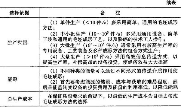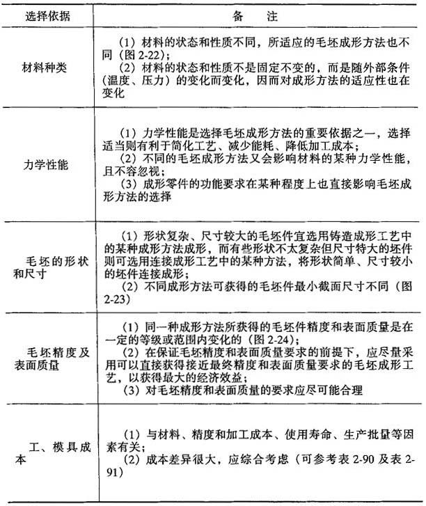 选择毛坯成形方法受许多因素的影响.这些因素通常被分为技术因素和经济因素两类,从而形成了在选择毛坯成形方法时必须遵循的两条原则,即技术上的可靠性和经济上的合理性.表2-97列出了毛坯成形方法选择的依据.