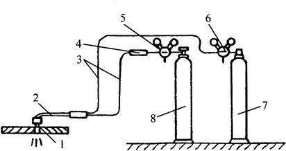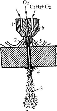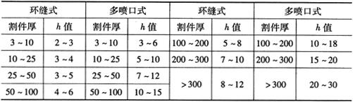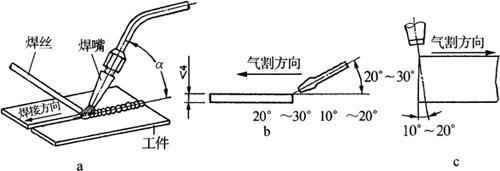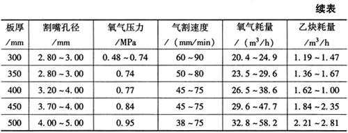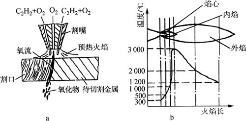 释义 | 气体切割 气体切割是利用气体火焰的热能,将工件切割处预热到一定温度后,喷出高速切割气流,使金属燃烧并放出热量而实现切割的方法。按火焰切割用气体不同,可分为氧-乙炔气体切割、液化石油气切割等。按操作方法不同,又可分为手工气割、半自动气割和数控自动气割。 (一)气割原理 1.气割使用气体 气割使用气体分为两类,即助燃气体和可燃气体,助燃气体是氧气,可燃气体是乙炔气或液化石油气等。气体火焰是助燃气体和可燃气体混合燃烧而成,形成火焰的温度可达3150℃以上,最适宜于焊接和切割。 纯氧本身不能燃烧,但在高温下非常活泼,当温度不变而压力增大时,氧气可与油类发生剧烈化学反应而自燃,产生强烈爆炸,所以要严防氧气瓶与油脂接触。 乙炔气(C2H2)又称为电石气,是不饱和的碳氢化合物,是一种可燃气体,当空气中乙炔含量在2.2%~81%时,遇到明火会立即爆炸,乙炔与空气混合的自燃温度为305℃,所以焊接和气割现场要特别注意通风。 液化石油气是裂化石油的副产品,主要由丙烷(占50%~80%)、丁烷等组成,在常压下为气态,在0.8~1.5kPa压力下就可变为液态。其中,丙烷在纯氧中燃烧的火焰温度可达2800℃左右,达到完全燃烧所需的氧气量比乙炔约大1倍,但其燃烧速度约为乙炔的一半。当丙烷与空气混合,若丙烷占2.3%~9.5%的体积时,遇有火星也会爆炸。 2.气割过程 气割由金属预热、燃烧和氧化物被吹除三个过程组成,如图8-14所示。开始气割时,必须用预热火焰将被切割处金属由表至里预热至燃点温度,一般碳钢在纯氧中的燃点为1100~1150℃,然后把气割氧喷射到温度达燃点的金属上,金属开始剧烈燃烧,产生大量的氧化物熔渣。由于燃烧时放出大量的热,使氧化物熔化成液态,并受喷射氧气流的作用,将氧化物熔渣吹掉,形成切口。 图8-14 气割原理 1.切割嘴 2.切割氧 3.氧化渣 4.割缝 5.预热焰 6.预热嘴 同时,金属燃烧时产生的热量和预热火焰,又进一步预热下层金属到燃点,使切割继续进行下去,即可形成割缝将金属分离。氧气切割过程实质是燃割而不是熔割,喷射氧气流很细,因此切口较窄而且整齐。 3.气割条件 金属材料只有满足下列四个条件,才能进行气割: (1)金属材料的燃点必须低于其熔点:低燃点是气割在燃烧中进行的基本条件,否则,切割时金属在燃烧前先行熔化,使之变为熔割过程,造成割口宽、边不齐等缺陷。 (2)金属氧化物熔点应低于基本金属的熔点:割口表面形成的固态氧化物熔点低且流动性好,才不会阻碍氧流与下层金属的接触,保证切割过程能正常进行(表8-4)。 表8-4 常用金属切割性能及燃点 (3)金属燃烧能放出较多气体:金属在燃烧时应能放出大量的热,并能成为预热下层金属的主要热源,保证切割过程能连续进行。 (4)金属的导热性要低:满足此条件的金属材料,只有纯铁和含碳量低于0.7%的低碳钢、中碳钢和普通低合金钢才宜于用气割。而铸铁、高碳钢、高合金钢及铜、铝等有色金属及其合金,均难以进行氧-乙炔气切割。例如,铸铁不能用氧气切割的原因是其燃点高于熔点,产生高熔点的二氧化硅(SiO2)等氧化物的黏度大、流动性差,高速气流不宜把它吹除。此外,由于铸铁的含碳量高,碳燃烧时产生一氧化碳及二氧化碳气体,降低了切割氧流的纯度,也造成气割困难。 (二)气割工艺 1.气割准备及操作 气割前将工件表面的油污和铁锈清理干净,并将工件垫起一定的高度,使工件下面留有一定间隙,以利于氧化铁渣的吹出。然后检查切割氧流线(风线),其方法是点燃割炬,调整好预热火焰后,打开切割氧阀门,观察切割氧流线的形状,使切割氧流线成笔直而清晰的圆柱体状,并持有适当的长度,如此才能使工件切口表面干净、宽度一致。否则,应关闭所有的阀门,熄火后用透针或其他工具修正割嘴的内表面,使之光滑无阻。 气割开始时,先将钢板边缘预热呈略微红色,后将火焰局部移出边缘线以外,并慢慢打开切割氧阀门,待预热红点在氧流中被吹掉时,再迅速开大切割氧阀门,随之将割嘴与工件表面由预热时的10°~20°倾角,转为90°垂直或其他位置气割。并且,待飞出氧化铁渣和整个断面割透移动割嘴时,即可按预定速度转入正常切割。 切割过程中(图8-15a),若遇割嘴端部过热或黏堵氧化铁渣影响乙炔供气时,割嘴端部会产生鸣爆及回火现象,应迅速关闭预热氧和切割氧阀门,阻止氧气流倒入乙炔管内,消除回火隐患。若此时割炬内仍然发出嘶嘶的响声,说明割炬内回火尚未熄灭,应迅速关闭乙炔阀门或拔下割炬上的乙炔软管,使回火的火焰气体排出。处理完毕后,应检查割炬的射吸能力无误后,方可重新点燃气割火焰。 图8-15 气割过程及火焰温度 a.气割过程 b.中性焰温度分布曲线 气割临近终点时,应将割嘴向切割反方向略微倾斜,使钢板切割终点的下部提前预热割透,以便收尾时割缝整齐;气割完毕后,应快速关闭切割氧阀门,并仰起割炬再关闭乙炔阀门,最后关闭预热氧阀门。 2.气割工艺规范 (1)预热火焰及能率:通常,氧-乙炔气割的预热火焰,应选择采用氧与乙炔混合比为1∶1~1∶2的中性焰,图8-15b为中性焰及其温度沿轴线分布图,其最高温度可达3000℃左右,且对高温金属氧化或碳化作用极小。预热火焰能率是用可燃气体每小时消耗量(L/h)表示,其大小取决于割炬型号及割嘴号码,以及割件厚度。割嘴孔径越大,火焰能率越大;割件越厚,预热所需时间越长,火焰能率也