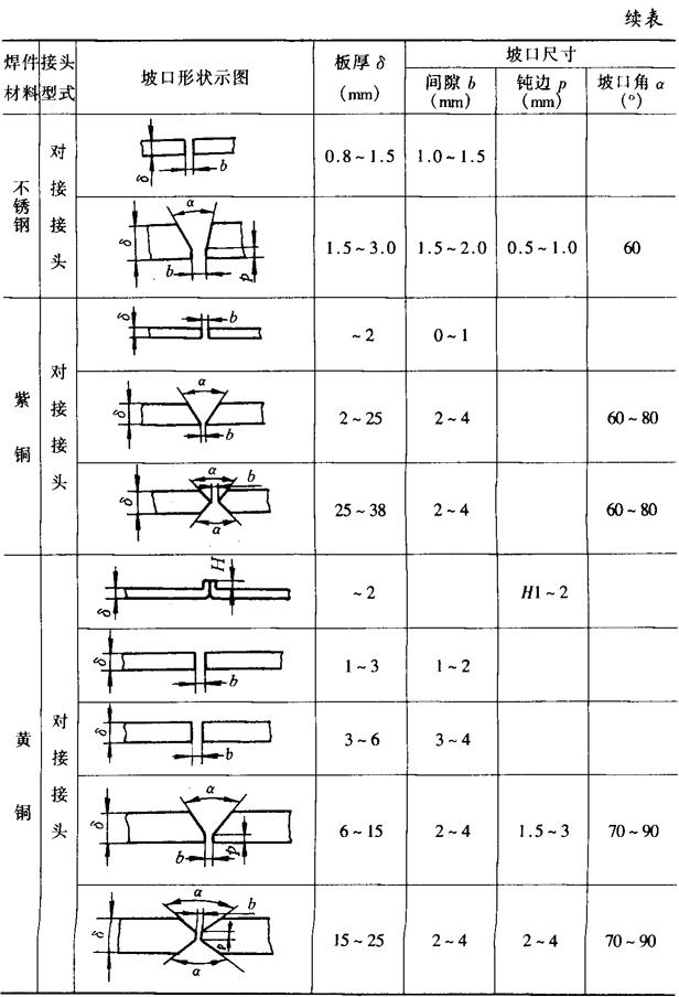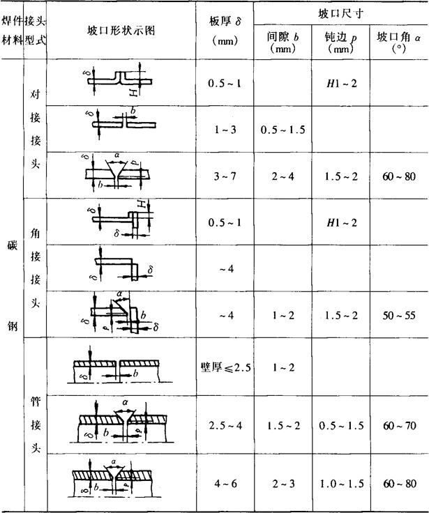 不同材料、不同厚度、不同接头形式的坡口形状及尺寸见表12-18。