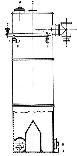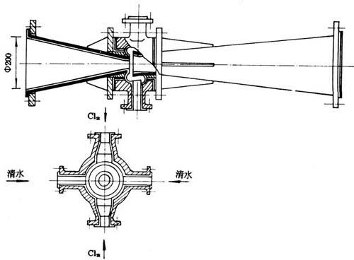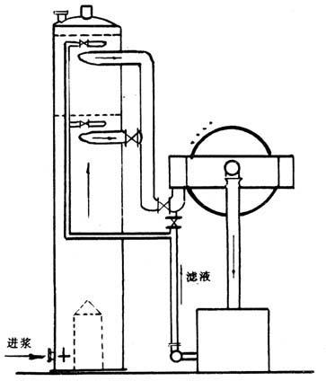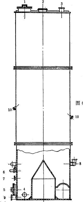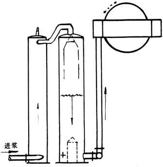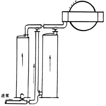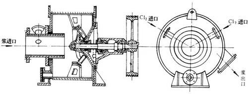 释义 | 氯化设备 1.氯化塔 (1)结构原理 CHE漂白流程中第一段氯化是在氯化塔中进行的。图6-6-6为升流式氯化塔,塔身为完全封闭的圆筒形。容积较小用钢板卷制,内衬橡胶;容积超过100m3时,采用钢筋混凝土结沿下部锥形体螺旋上升,上部有一个倒置的圆锥体,浆料升到其附近在环形喷水管被稀释出料。为提高生产效率,方便操作,强化氯化过程,目前已有四种能改变氯化停留时间的氯化塔。图6-6-7为带中央升流管的氯化塔,塔内装螺旋挡板,起设备加固作用,同时从中央管溢出纸浆沿螺旋板缓慢下降。图6-6-8为出浆口位置可改变的升流塔,在塔的不同高度有两个出浆口,每个出口上方有喷嘴,水从切线方向进入塔内,促进纸浆流动,防止空气带入浆中。设计不同出浆位置的升流塔,是考虑到不同季节的水温影响氯化速度和氯化时间的缘故。图6-6-9为可并联、串联的升流塔,用阀门调节串联、并联或单塔使用,如两塔容积比为1:2则可有三个不同氯化时间供选择。图6-6-10为带预停留管的降流式塔,氯化反应很快,5min内可消耗总用氯量的80%。设计10min氯化时间已足够。氯化时间是靠调节降流塔液面来控制的。 图6-6-5 氯化塔 1-进浆口 2-出浆口 3-风机吸人口 4-排污口 5-人口 6-观察口 7-浸水入口 8-针形阀 图6-6-6 中央升流管氯化塔 图6-6-7 可变出浆口升流式氯化塔 图6-6-8 并联串联升流氯化塔 图6-6-9 带预停留器降流式氯化塔 图6-6-10 喷射式浆氯混合器 (2)主要技术特征及规格 表6-6-2为上海化工机械厂生产的几种型号的升流式氯化塔的主要技术特征。 表6-6-2 升流塔(氯化塔)的主要技术特征 氯气及浆氯反应后的酸性废液具有强烈的腐蚀性,塔内壁的防腐材料可采用如下几种: ①钢板塔体内衬硬质橡胶,衬层厚度在5mm以上。 ②混凝土塔体内衬玻璃钢。 ③混凝土塔体内衬耐酸砖,用聚酯树脂贴砖、勾缝。 ④采用混凝土塔时,必须注意施工质量,这种塔发生渗漏不易发现,往往发现时已严重腐蚀,修补比较困难。 ⑤氯化塔搅拌器可衬硬橡胶或铂钛不锈钢。 2.浆氯混合器 供氯水或氯气与浆料均匀迅速混合之用的混合设备。 氯气与浆料反应在常温下进行,浆料浓度约为2.5~3.5%。 (1)喷射式浆氯混合器 利用文丘里节流原理,浆料由渐进管进入喉管吸入室,使氯气系统形成负压,进入的氯气很快与纸浆充分均匀的混合后被纸浆吸收,经扩散管送出。缺点是浆料稀释作用大。 表6-6-3 喷射式浆氯混合器工艺条件 (2)涡轮式浆氯混合器 利用涡轮搅拌进行浆氯混合的。同时进入的浆和氯,经涡轮沿器壁呈涡流旋转而向出浆口流出。 涡轮浆氯混合器是在低压头(0.1MPa),高容量下进行混合,即节省氯气,又缩短了反应时间,是-种混合作用较好的浆氯混合器。 图6-6-11 涡轮式浆氯混合器 表6-6-4 涡轮式浆氯混合器技术特征 (3)静态混合器 是一种管道混合器,是利用组装在管道内的不同结构的单元,使各种流体达到良好的分散和混合。 ①原理:浆料和氯气或二氧化氯通过螺旋挡板分割成两部分,继而又混合合流一体,多次反复的分流与合流,达到浆氯均匀混合的目的。 a.单元对流体起切割作用。 b.单元使流体的流道形状与截面积发生变化,产生剪切作用。 c.单元使流体产生旋转,起到自行搅拌作用。 ②特点:静态混合器是一种较先进的无传动的混合装置,可以使高浓浆料与较浓的漂剂获得充分混合。 与动态的搅拌、喷射混合等相比,其混合效果均匀,能耗省,单元混合作用处理量大,连续化程度高,可实现仪表控制。 由于在管道里进行,对有毒、易污染介质的混合特别适用。 雷诺数适用范围很广,是目前解决液液、液固、液气、气气混合,吸收、传热等操作的理想设备。 ③国内静态混合器主要结构见表6-6-5。 表6-6-5 国内静态混合器主要结构 造纸行业多选用SK型。 表6-6-6 螺旋板静态混合器技术特征 图6-6-12 MSA圆盘浆氯混合器及装配尺寸 1-连接键 2-底板 3-氯气入口 4-密封水管接(318″) (4)圆盘浆氯混合器 ①原理及构造:它是一个靠两个转盘和壳体之间产生揉合作用达到均匀混合的装置,其全名称为:“桑茨——茵柏柯MSA圆盘浆氯混合器,由瑞典桑茨公司制造,可直接安装在浆料输送管线上,如图6-6-13,图6-6-14所示。其构造主要由一个圆柱形外壳,两个用螺柱连接的端盖和一个转子组成,外壳上有三个开口,分别用于进浆、出浆和放空清洗,如图6-6-15所示。在浆料入口处设有耐蚀塑料制的双法兰,转子轴上焊有两个倾斜排列成V型的多孔圆盘,见图6-6-16。轴的两端支承在滚子轴承内,没有可以替换的耐酸钢衬套。轴承通过两个端盖的填料箱装设直径10mm的密封水管。水压超过混合器内压力0.1MPa,用水量约5L/min。 图6-6-13 装配形式(箭头示浆流向) 图6-6-14 MAS圆盘浆氯混合器剖面 图6-6-15 转子结构 图6-6-16 降流式碱处理器 1-观察孔 2-进浆口 3-排汽口 4-出浆口 5-人孔 6-针形阀 7-液位计接口 8-浸水管 9-排污口 10-测温点 ②主要技术数据 生产能力:175t/d; 浆料浓度:3.5%; 转子转速:600r/min; 电机功率:25kW。 3.氯化段附属设备的防腐 (1)浆氯混合器 ①与纸浆接触部分可内衬硬质橡胶。 ②搅拌辊可衬钛板或用含铜钛不锈钢(钛板不能用于干氧气),普通不锈钢不适用。 (2)干燥氯选用材料 ①普通碳钢:采用钢管作为输氯管,经济耐用,切忌带入水分,否则很快腐蚀。 ②铜,质软,多用于连接液氯钢瓶一段。 ③萨冉树脂,为聚偏氯乙烯树脂,可用作内衬层。硬质橡胶