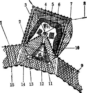 释义 | 水库捕捞网具——畚斗网 畚斗网又称簸箕网,有些地区直接称为张网,是浙江省新安江水库广大渔业工作者,创造的一种新型网具,由于它在对捕捞上层鱼类(尤其是鲢、鳙鱼)中,结合“赶、拦、刺、张”联合作业的方法效果好,产量高,因此近几年来全国各地大、中型水库基本都在使用这种渔具,而且对这种网具也在不继改进,以使网具更趋完善(图2-64)。 图2-64 畚斗网结构示意图 1.翼网;2.内八字网;3.侧墙网;4.进鱼口;5.底网;6.后墙网;7.大浮球;8.锚;9.浮子;10.盖网;11.铅棒;12.三角网;13.沉石;14.舌网;15.沉子 畚斗网由身网和翼网组成。身网又由底网、侧墙网、后墙网、内八字网、三角网等组成。翼网可由装盖网的或不装盖网的拦网组成。身网高度必须与放网处水深相适应,一般宽高比为1-2∶1。长高比为2-3∶1。身网一般高10-36米,阔10-30米,长30-60米。八字网的夹角一般为55°-65°,内口阔为0.6-1.0米。盖网高1-2米。翼网(用拦网代替)高度必须大于该处水深,长度应能放至岸边。 身网除底网外,网目大8-12厘米,网线较粗,一般用43支/6×3-9×3股的锦纶线。底网网目大8-10厘米,网线为43支/8×3-12×3股的锦纶线,用聚乙烯线比重小于1,不宜采用,否则会有碍进鱼。缩结系数为0.55-0.65。 定置张网作业时,身网放在水深处,八字网外端连接着放到岸边的翼羽。当鱼被赶集到网口附近时,在刺网等渔具躯赶下,鱼就沿着翼网、八字网进入八字网内口而到达箱内。由于八字网内口小(只占身网的宽度或长度几十分之一),而鱼向各方向游的机会是均等的,鱼就不易围出网外。 |