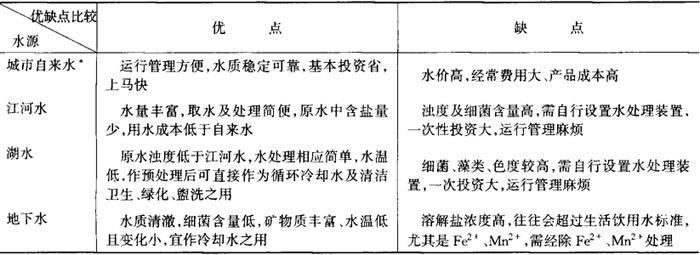 释义 | 水源选择 选择水源要根据当地的水源具体情况,结合生产及生活用水对水质的具体要求,并经过详细的技术经济比较,确定采用一种或几种水源,以达到经济合理,又能满足生产、生活的要求,在有城市自来水的地方建厂,应首先考虑使用城市自来水,工厂如自建水厂,应达到国家规定的《生活饮用水卫生标准》的要求。表6-7-6为各种水源的优缺点比较。 表6-7-6 各种水源的优缺点比较 *在有城市自来水的地方,应首先考虑采用之,其次再普查地下水,而后再考虑江、河、湖的处理自建水厂。 |