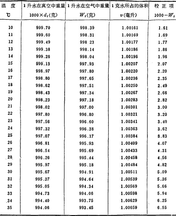 在t℃称得水重W克,则量取W克水的玻璃仪器容积:V20=W×v(ml)或V20=×1000(ml)(式中V20是指玻璃容器在20℃时所具有的容积)。