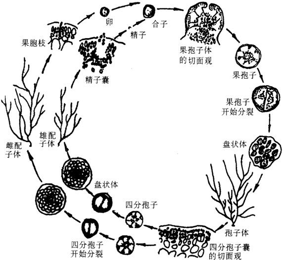 释义 | 江蓠的生物学 (一)江蓠的分类地位 江蓠属于红藻门(Phodophyta),真红藻纲(Florideae),杉藻目(Gigartinales),江蓠科(Gracilariaceae),江蓠属(Gracilaria)。 (二)江蓠的形态构造 江蓠的种类很多,中国沿海常见的有20多种。藻体为软骨质或肥厚多汁,易折断,颜色呈紫红色、暗紫绿色或暗褐色。体枝有圆柱形、亚圆柱形、扁平和叶状。株高5~45厘米,有的可达1米以上。基部有一盘状固着器。分枝互生、偏生,叉状或不规则,有的分枝基部缢缩或渐细,藻体单轴(图6-27)。藻体的内部,由皮层和髓部组成。髓部细胞大而不规则,皮层细胞较小,含有色素体,细胞排列比较整齐紧密。皮层细胞的层数依种类而不同,一般3~5层。 图6-27 江蓠的形态 (三)江蓠的繁殖和生活史 江蓠生活史中有三个不同的世代,即孢子体、配子体和果孢子体。孢子体和配子体在非繁殖季节,外形上没有明显的差异,在繁殖季节雌雄配子体上附生着向外突起的果孢子体,与孢子体能明显区分出来。在繁殖季节一般都可以同时找到三种藻体。江蓠的孢子体是由果孢子萌发而成,孢子体成熟时,皮层细胞发生变化,有的形成孢子囊母细胞,经分裂形成四分孢子。四分孢子成熟后,脱离母体,遇到生长基质便附着,萌发成配子体。 雌配子体成熟时,由皮层细胞产生果胞。雄配子体成熟时,由顶端的表皮细胞产生精子囊,精子囊产生精子,精子成熟后,放散到海水中,漂流到雌配子体的果胞上与之受精,成为合子。合子经过发育形成半球形的个体,称为囊果,即果孢子体。果孢子体成熟后,里面的果孢子便从顶端小孔放散出来,经附着萌发生长成为孢子体。 四分孢子与果孢子的形态相同,萌发过程相似。刚放散出来的孢子,大小为25~35微米,一般呈椭圆形,经10~20分钟后,吸水膨胀变为圆形。 孢子放散后,形状变为椭圆形,开始进行分裂,以后每个细胞进行几次不规则的分裂,而形成许多不定形的小细胞,再经过一些时间,便形成小盘状体。以后盘状体开始分化,中心细胞形成了分裂组织,逐渐向上隆起,形成直立体。在幼苗的基部则形成盘状的固着器。 图6-28 江蓠的生活史 根据试验观察,在水温21~24℃、海水相对密度1.022的条件下,孢子经6天左右可发育成小盘状体,17天后形成直立体。 江蓠还有营养体繁殖的特性,不论配子体或孢子体,都可以折枝分成小藻体,这些小藻体能继续生长发育,长成大藻体。大藻体长成后,还可继续再折枝繁殖,只要环境适合,便可以一直繁殖下去。 |