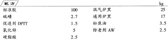 先将标准胶和促进剂DPTT混合塑炼,再加入其余全部组分混炼,薄通,即得帘布层胶料,帘布层挂胶后用于轮胎成型。