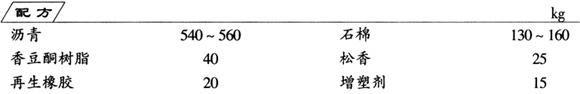 将沥青熔化脱水后,在160~180℃下,加入石棉粉混合均匀,再逐步加入香豆酮树脂及再生橡胶屑、松香,混合均匀后加入增塑剂,再搅拌20min,即为成品。