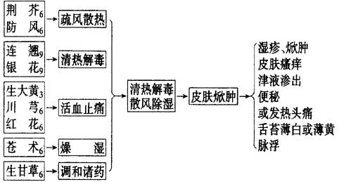 【注意】 本方适用湿疹,焮肿,属风热血瘀者。湿疹偏于气血两虚者忌用。
