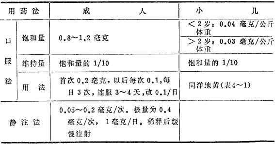 【用法和用量】 洋地黄毒甙片剂每片0.05或0.1毫克;针剂每1毫升含0.2毫克。详见表4~2。