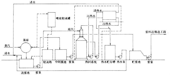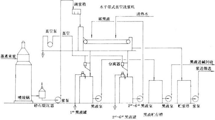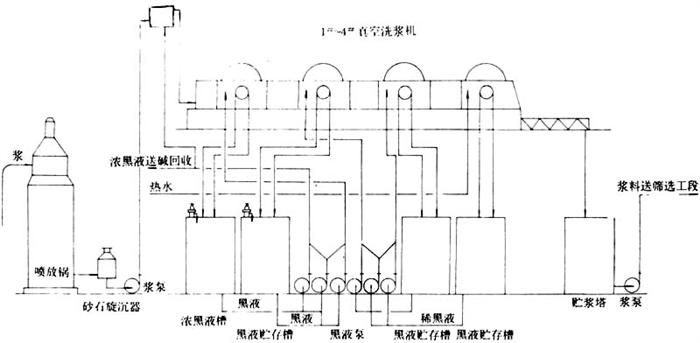 释义 | 洗涤工艺方法与技术条件 1.工艺流程 流程一(球下池单向过滤洗涤)见图5-7-8。 图5-7-8 球下池单向过滤洗涤 流程二多段鼓式真空洗涤机逆流洗涤见图5-7-9。 图5-7-9 多段鼓式真空洗浆机逆流洗涤 流程三水平带式真空洗涤机逆流洗涤见图5-7-10。 图5-7-10 水平带式洗浆逆流洗涤 2.洗涤方法与技术条件 (1)球下池洗涤 冲浆清水压力:0.3MPa以上; 浆层厚度:0.5~1.0m; 洗涤次数:3~4次。 (2)真空洗浆机洗涤 表5-7-17 四段逆流洗浆条件(Φ2.6m真空洗浆机) 洗涤用热水温度:65~80℃; 一段黑液直测温度:75~80℃; 四段出浆浓度10~14%; 一段黑液浓度8°Be′以上(15℃)。 (3)水平带式洗浆机洗涤 进浆浓度:2.5~4%; 出口浆浓:14~19%; 浆层厚度:8~15mm; 洗涤热水温度:75~80℃; 总管真空度:37.33~40.0kPa; 各真空箱真空度;:13.33~26.66kPa; 喷水管水压:190~300kPa; 提取黑液温度:65~70℃; 提取黑液浓度:6°Be′以上。 3.质量指标 洗净度:洗后残碱≤0.10g/L(Na2O计)。 |