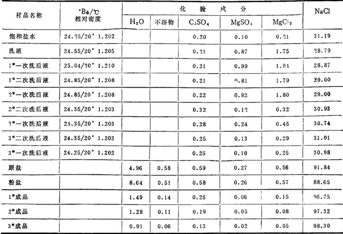 注:取洗盐厂洗液对1#样进行两次洗涤,洗后离心机甩干。2#样洗盐厂洗液作为一次洗液,饱和盐水作为二次洗液,洗后离心机甩干,3#样用饱和盐水加热至60℃进行二洗,甩前在60℃温水中淋浸,离心机甩干。