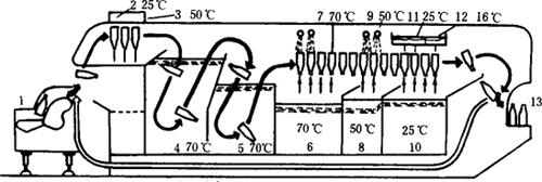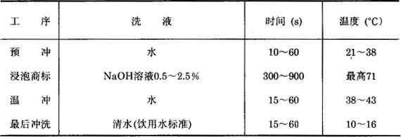 图6-2-1 浸洗瓶过程 1-进瓶 2-第一次淋洗预热(25℃) 3-第二次淋洗预热(50℃) 4-洗涤剂浸瓶Ⅰ(70℃) 5-洗涤剂浸瓶Ⅱ(70℃) 6-洗涤剂喷洗(70℃) 7-高压洗涤剂瓶外喷洗(70℃) 8-高压水喷洗(50℃) 9-高压水瓶外喷洗(50℃) 10-高压水喷洗(25℃) 11-高压水瓶外喷洗(25℃) 12-清水淋洗(15~20℃) 13-出瓶 气温炎热的夏天回收的瓶子常有霉菌或酵母寄生,洗瓶时碱液浓度要求为4~5%,清洗次数和压力均要增加。浸泡时间和温度见表6-2-1所示。 表6-2-1 洗液浓度、时间和温度的关系