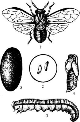 释义 | 浙江黑松叶蜂 【学名】 Nesodiprion zhejiangensis Zhou et Xiao。 【分布与为害】 分布浙江、江西等地。寄主有日本五针松、乔松、黑松、马尾松、晚松等。幼虫食针叶,严重时仅留松针基部,针叶参差不齐,造成树势衰弱,翌年萌芽短小。 【形态特征】 成虫体长5.8~7.8毫米,黑色。头、胸部略有光泽。触角双栉齿状。中胸小盾片黑色。雌虫第七、八腹节背板两侧缘斑点黄白色。翅透明,翅痣和翅脉黑褐色(图10-18)。卵长椭圆形,长1.6~2.0毫米,淡黄色。幼虫体长18毫米左右。胸、腹部嫩绿色,背面有2条绿色纵线。体侧各有1条深蓝色或墨绿色气门上线。蛹为裸蛹,粗圆锥形,黄绿色。茧丝质,长椭圆形,长8~10毫米,黄褐色。 图10-18 浙江黑松叶蜂 1.成虫 2.卵 3.幼虫 4.蛹 5.茧 【生活习性】 在浙江,1年发生3~4代。以预蛹在茧内越冬。茧结在针叶丛间或枝权间。翌年4月中、下旬羽化、交尾产卵。第一、二代成虫分别于6月下旬至7月上旬,8月下旬至9月上旬羽化。各代的幼虫分别在5~6月,7~8月,9~11月发生。第三代幼虫于11月中、下旬老熟结茧。 成虫产卵于叶组织内,每头雌虫可产卵50粒左右。幼虫有群集性,一般在树的向阳面较多。 幼虫天敌有选择盆地寄生蝇、3种姬蜂及白僵菌寄生。 【防治方法】 成虫羽化期喷10%速灭杀丁2500倍液,或2.5%保得3000倍液,或80%敌敌畏1000倍液。幼虫期喷50%杀螟松1000倍液,或40.7%乐斯本3000倍液,或90%敌百虫1000倍液。 |