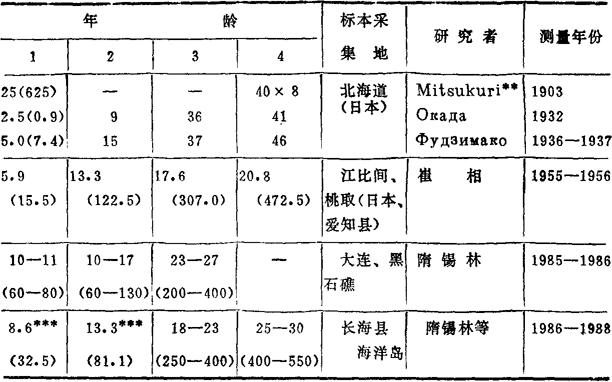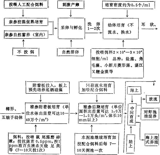 释义 | 海参增养殖 现全球已发现有海参800多种,我国已有记载的约100余种,但能食用的仅有20余种。就其产量和品质而言,又以仿刺参等7种为主要经济种。 一、我国海参主要经济种类(表22—1) 表22—1 我国海参主要经济种及其产区 二、生态特性(以刺参为例) 刺参多分布在水深20—30m以浅的海区,幼小个体多分布在水深5m以内的近岸区。多栖息于波流静稳、无淡水注入、海藻繁茂的岩礁底和大叶藻(俗称海韭菜Zostera marina)丛生的细沙泥底。生活时最大个体体长可达40cm以上。 摄食方式主要靠其触手不断地扫、耙海底表层的沉积物,其中包含有砂、泥、砾颗粒、贝壳碎片等为主体,也包括混在其中的以硅藻(60余种)为主的浮游植物及海藻碎片。此外,还包含有原生动物、螺类及双壳类的幼贝、桡足类及虾蟹类的蜕皮壳、大叶藻及岩屑和细菌等。刺参的摄食量大并依季节有较大的变动,其摄食率与个体大小无关只与季节有关,即在8月中旬为体壁重的0—10%;12月上旬为5—35%;3月上旬为20—45%。一头体壁重200g的个体年间可摄食13.1kg(15900ml)的饵料。 刺参的生长依地域及饵料的多寡差异较大,现将部分研究者的资料列于表22—2。 表22—2 刺参的生长* * 体长单位cm,括号内为体重,单位g; * * 1龄测量结果偏大,大部分学者提出异议; * * 为放流参苗的观测结果,年龄为满龄,2.5周年体长16.3cm,体重167.3g,最大个体重为300g。刺参的产卵期及产卵盛期依地域不同而有不同。据报道,大连、黄海北部产卵盛期为7月上、中旬至8月中、下旬(水温17—22℃),而渤海区比黄海北部要早15天左右;北戴河为5月中至7月上旬;烟台、威海等地为5月上旬至6月末。日本的北海道为6月下旬至9月上旬。产卵开始的水温为13—17℃,通常为16—17℃。 三、增养殖技术 1.人工育苗工艺流程模式 2.中间育成 为确保海区筏式养殖及放流用的种苗,提高成活率,需将室内当年培育的体长1.0—1.5cm的幼参经中间培育至3cm左右。 场地:以不投饵为条件的中间育成,其场所要设在有机物和浮泥能够较容易地进入,并沉积于育成笼内的泥底内湾。该处必须是风浪小,有机悬浮物较多。 设施:日本采用鲍中间育成笼。其金属框架规格为60×60×30cm,外包网目为1.4mm的网衣(如种苗规格较小,网目可采用0.5—1.0mm)。笼内铺设黑色波纹板,收容密度为300—400头/笼。约经3个月的育成,体长可达30mm左右,成活率可达80—100%。 3.海区筏式养殖 筏式养殖是近年刚刚兴起的事业,技术尚不够完备。 场地选择:养殖设施应设在风浪小,有机质及浮泥较多,不受季节风影响且操作较为方便的内湾。 器材及设施:目前在日本用于养殖的设施为延绳式(浮筏式)。为减少震动多采用吊浮(浮力与绠绳间可有1m左右的吊绳)。用于养殖的器材尚不统一,有长方形的网箱或“珍珠笼”;也有用聚氨基甲酸乙脂制成的圆形鱼筐(为鳗鱼养殖及活鱼运输用的市售品),鱼筐外绑缚坠石以保持其在水底层或在海底的稳定。 在国内,辽宁省海洋水产研究所(1988年)采用扇贝中间育成用网箱(70×40×40cm)进行中间育成后,采用具拉链的鲍养成笼或扇贝养成笼进行投饵养殖,即投喂刺参用配合饵料进行筏式养殖。 养殖效果:在日本,经中间育成后的种苗,再经过1年的养殖,平均体长达8.4cm,最大个体达13cm。在养殖过程中应及时进行筛选,分级可加快养殖,生长快的个体可达13—14cm,这样经2—2.5年的养殖可达到商品规格(17—20cm)。 4.池塘养殖 为充分利用对虾养殖池并改善其底质条件。近年,国家海洋局一所在山东威海市双岛湾对虾养殖池或盐水沟底放养幼参获得成功。场地应选择在有机质丰富但污泥不太厚,池底丛生大量水草,并杂以砂砾及碎贝壳的养虾池。放苗前应在池底成行铺设瓦片或其他附着基质,瓦片间造成的空隙以利于幼参栖息。此外,进、排水要方便,冬季不结冰或仅结一层薄冰,水深应在70cm以上。据报道,放养体长5cm以上种苗,可望放养2年达到商品观格。此项事业刚刚起步,目前已在山东、辽宁等地逐步在推广。 5.天然采苗及放流增殖 (1)天然采苗:我国目前尚未开展此项事业,而日本的长崎县大村湾及爱知县的佐久岛等地已开展了此项工作。其方法是:在采苗设施投入之前,对选定区域的亲参数量及分布,浮游幼体的数量变动及分布等进行必要的调查,然后再决定投放采苗器材的时间、数量、水层等。 采苗器通常采用珍珠养殖用的圆笼(直径45cm,网眼孔径3cm),每笼放入5kg牡蛎壳(120—130个贝壳),每吊2笼,吊绳间距为0.75m,绠绳长24m,采苗器投放水层为1—4m,绠绳采用锚缆固定。也有的采用改良的纤维网笼,网笼内放入椰子纤维、旧网衣、牡蛎壳等(爱知县)。 采苗效果,日本大村湾每笼可采到幼参59尾(1978年)和104尾(1979年),至10月末,连同牡蛎壳一同放入增殖区(此时幼参体重为0.78—3.33g/尾)。他们进行经济核算的结果认为,如每笼能采到20尾以上,放流后的回捕率为40%,其效益是明显的。 (2)种苗放流: 放流场的条件:根据刺参的生态特点和生活习性,放流场应选择在避风的内湾或风浪不大的湾口的近岸区。水质清新、盐度适宜且无大量淡水注入、潮流通畅、流速缓慢或具涡流的区域。水深应在10m以内,底质应以礁石、石砾或以细砂为主(含量不少于80%),底质表层有机质丰富,并具较密集的底栖硅藻,如有密集的大叶藻簇生或聚集着其他大型藻类更为适宜。 放流方法及效果:参苗采用水运,水槽盛装密度
