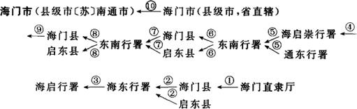 ①1912年改海门直隶厅为海门县。②1941年9月海门县、启东县合并,称海东行署。③1941年12月将海东行署改名为海启行署。④1942年7月崇明划归海启行署后改称海启崇行署。⑤1942年9月海启崇行署和通东行署合并,称东南行署。⑥1946年3月至12月,海门、启东两县恢复建制。⑦1947年1月海门县、启东县复合并成立东南行署。⑧1949年2月海门全境解放,海门、启东分别成立县政府。⑨1994年4月26日撤销海门县,设立海门市(县级市),由省直辖。⑩1995年海门市(县级市)改为由省直辖,地级市代管。