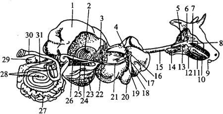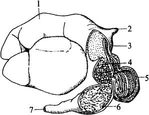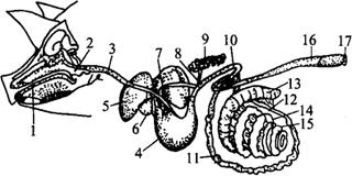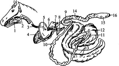 释义 | 消化系统 畜体在生活中必须从外界摄取食物,吸收其营养供生长、发育、生殖等需要,同时排出残渣。这一任务主要依赖于组成消化系统的消化管和消化腺。消化管包括口、咽、食管、胃、小肠、大肠和肛门;消化腺包括唾液腺、胃腺、肠腺、肝、胰等(图1-7)。 A 马的消化系统模式图 1.口腔 2.咽 3.食管 4.肝 5.胃 6.肝管 7.胰管 8.胰 9.十二指肠 10.空肠 11.回肠 12.盲肠 13.大结肠 14.小结肠 15.直肠 16.肛门 B 牛消化系统模式图 1.瘤胃 2.瓣胃 3.食管沟 4.肝动脉 5.腮腺 6.咽 7.软腭 8.鼻后孔 9.口腔 10.舌 11.舌下腺 12.颌下腺 13.喉 14.气管 15.食管 16.肝管 17.胆囊管 18.肝 19.门静脉 20.胆囊 21.胆管 22.网胃 23.皱胃 24.胰导管 25.胰 26.十二指肠 27.空肠 28.结肠 29.盲肠 30.直肠 31.回肠 C 猪消化系统模式图 1.口腔 2.咽 3.食管 4.胃 5.肝 6.胆囊 7.胆管 8.胰管 9.胰 10.十二指肠 11.空肠 12.回肠 13.盲肠 14、15.结肠圆锥 16.直肠 17.肛门 图1-7 消化系统模式图 (1)口腔 包括唇、颊、腭、舌、齿和唾液腺等。唇分上唇和下唇。猪上唇与鼻连在一起构成吻突。牛的上唇与鼻一起构成鼻唇镜,因其内有鼻唇腺,故常保持湿润。颊位于口腔两侧,有唾液腺管开口于此。腭分为构成口腔顶壁的硬腭和构成口腔后壁的软腭。 舌在咀嚼和吞咽过程中起搅拌和推进食物的作用,分为舌尖、舌体和舌根三部分。牛舌尖和舌体交界处的腹侧有舌系带,舌系带两侧有一对舌下肉阜,也叫卧蚕。颌下腺就开口于此。舌表面分布有味蕾,起味觉作用。 齿在畜体内最坚硬,起采食和咀嚼作用,分切齿、犬齿和臼齿三种。 唾液腺主要有腮腺、颌下腺和舌下腺3对,所分泌的唾液能软化食物,便于咀嚼、吞咽和促进消化。 (2)咽和食管 咽是消化管和呼吸道的交叉通道。食管是运送食物的管道,接于胃的贲门。 (3)胃 分单室胃(如猪和马的胃)和多室胃(如牛、羊的胃)。单室胃呈弯曲的囊状,贲门与食管相连,后由幽门与小肠相接。胃黏膜靠近贲门处颜色苍白,无腺体,称无腺部;其它部分称有腺部。其内的腺体能分泌胃蛋白酶、凝乳酶、脂肪酶和盐酸,分别将蛋白质分解为 多室胃由瘤胃、网胃、瓣胃和皱胃所组成。通常把前3个胃称前胃(图1-8)。瘤胃最大,占据腹腔的左半部和右腹下部。瘤胃黏膜能吸收大量水分。网胃为前后稍扁的梨状囊,位于瘤胃的前下方,与第六至第八肋相对。其黏膜面的皱褶形如蜂窝,故又称蜂巢胃。瓣胃为左右稍扁的椭圆形囊,位于右侧肩关节水平线上与第七至第十一肋相对。其黏膜形成的皱褶叫瓣叶,俗称“百叶”。皱胃呈弯曲的葫芦状,位于腹前部的右下侧。 图1-8 牛胃剖面图 1.瘤胃 2.食管 3.食管沟 4.网胃 5.瓣胃 6.皱胃 7.十二指肠 多室胃的消化过程较为复杂,有下列特点: 第一,有一条起于贲门、止于网瓣孔的食管沟。当犊牛吸吮乳汁时,食管沟就闭合成管状,奶汁就从食管沟经瓣胃沟直达皱胃。 第二,牛羊采食饲料时不充分咀嚼就匆匆吞入瘤胃,在休息时再将饲料逆呕到口腔,细细咀嚼并混合大量唾液后再吞下,这一过程叫反刍。这也是多室胃动物又叫反刍动物的原因。 第三,在瘤胃内主要进行微生物消化。瘤胃内的细菌、纤毛虫和真菌能分解纤维素、淀粉和蛋白质,并利用分解产物和非蛋白质含氮物合成菌体所需的营养。这些微生物进入皱胃和小肠后,被畜体所利用。因此,可以用少量尿素代替部分日粮蛋白质喂牛。 第四,瘤胃发酵产生的气体能通过口鼻排出,这叫嗳气。 (4)小肠 包括十二指肠、空肠和回肠。在小肠内有胰腺分泌的胰液、肝脏分泌的胆汁和小肠分泌的小肠液对食糜起消化作用,将蛋白质、 (5)大肠 包括盲肠、结肠和直肠。大肠内的微生物能分解纤维素为低级脂肪酸,还能合成维生素B族和维生素K。 (6)肝 呈红褐色,位于右侧腹腔前端,是体内十分重要的器官,具有代谢、解毒、分泌、防御等机能。 (7)胰 呈粉红色,由分泌胰液的外分泌部和分泌激素以调节血糖的内分泌部组成。 |