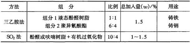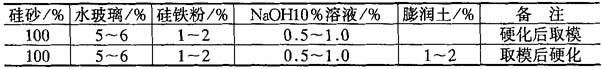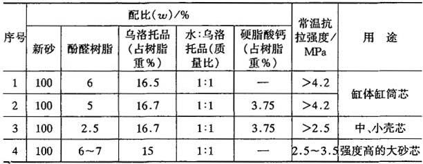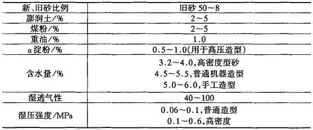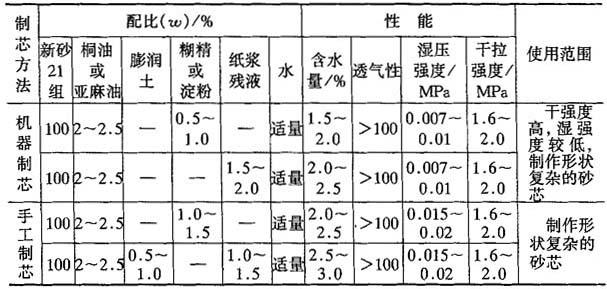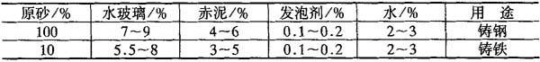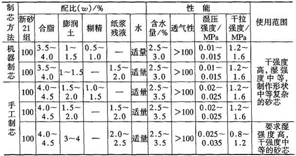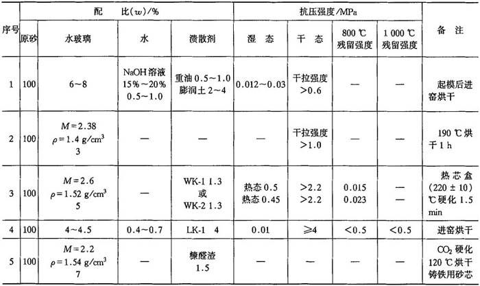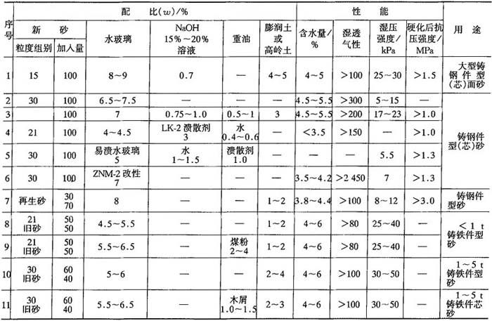 5.2.3.1 以黏土为黏结剂的型砂和芯砂 黏土砂湿型的配比及性能见表5-38. 表5-38 湿型的配比(w)及性能  5.2.3.2 以水玻璃为黏结剂的型砂和芯砂 水玻璃CO2硬化砂的配比和性能见表5-39. 烘干硬化水玻璃砂配比及性能见表5-40. 硅铁粉水玻璃自硬砂配比及性能见表5-41. 水玻璃流态自硬砂配比见表5-42. 5.2.3.3 以油类为黏结剂的芯砂 桐油或亚麻油芯砂的配比及性能见表5-43. 合脂芯砂的配比及性能见表5-44. 5.2.3.4 以树脂油类为黏结剂的型砂和芯砂 热法覆膜壳芯砂配比见表5-45. 冷芯盒砂配比见表5-46. 表5-39 水玻璃CO2硬化砂的配比及性能  表5-40 烘干硬化水玻璃砂配比及性能  表5-41 硅铁粉水玻璃自硬砂配比(w)及性能  表5-42 水玻璃流态自硬砂配比(w)  表5-43 桐油或亚麻油芯砂的配比及性能  表5-44 合脂芯砂的配比(w)和性能  表5-45 热法覆膜壳芯砂典型配比举例  表5-46 冷芯盒砂配比