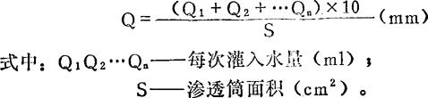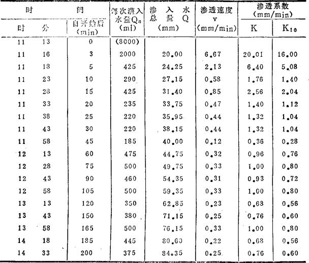 释义 | 渗透筒法 1.仪器设备 渗透筒:铁制圆柱形筒,横截面积为1000cm2,内径358mm,高350mm。 量筒:500ml和1000ml各一个。水桶打水用。 温度计:0-50℃。停表或一般钟表。 木制厘米尺、小刀等。 2.测定步骤 在选择具有代表性的地段上,布置一块约1m2的圆形直径约113cm试验地块,将其周围筑以土埂。土埂高约30cm,顶宽20cm,并捣实之。渗透筒置于中央,应用小刀按筒的圆周向外挖宽2-3cm,深15-20cm的小沟使筒深深嵌入土中。插好后,把取出的土壤重新填入隙缝并予捣实,防止水分沿壁渗漏损失。筒内为试验区,外部为保护区。 在筒内、外各插入一米尺,以便观察灌水层的厚度。水层厚度均保持为5cm,先在外部保护区迅速灌水,并立刻把相当于5cm深水层的水倒入筒内。因为从一开始时水就向土壤内渗入,所以必须很快的把它倒到预期的水层厚度。为了使灌入的水不致冲刷表层土壤,不应将水直接倒在土面上,而应在筒内外灌水处用胶板或木板(甚至杂草或蒿秆)保护之。 为了便于换算成10℃时的渗透系数,应在筒内插入温度计,读取测定时的温度。 当试验区内部灌水到5cm高时,应立即开始计时,每隔一定时间进行一次水层下降的读数,准确至毫米数,读数后立即加水至原来5cm的高度处,每次加入水量应记下,并随时记录相应的温度变化。第一次读数和加水是在计时开始后的2min,3min后读第二次,以后每隔5-10min读一次。如果渗水很慢,则可隔半小时或1h进行一次。 在测量渗透速度的最后阶段,所得到的各段间隔时间内的数值,彼此差值很小,试验即可告结束。试验持续时间,砂土一般为4-6h,粘土为6-8h。如果透水性很小,则延续12h或24h,但也不必延续过久。 3.结果计算 (1)渗入水总量 例如,试验时间为10min,则 (2)渗透速度 式中:Qn——间隔时间内灌入水量(ml); tn——所间隔的时间(min)。 例如,由12时28分至12时43分历时15min内,渗透速度v=]。 (3)渗透系数 式中:L——渗透筒插入土中的深度(cm); h——试验时保持的水层厚度(cm)。 例如,由12时28分至12时43分的时间内,渗透系数K= (4)把Kt值换算为K10值。 例如,Kt为0.93mm/min,则: 4.注释 (1)试验应重复二次。每一剖面最好在三个深度上分别测定其渗透性,这三个深度是表土、心土和底土层,或根据试验目的而进行。 (2)在渗透筒插入土壤时,特别要注意筒壁与土壤间的紧密接触问题。如有隙缝,土壤渗透性将增大。 (3)土壤表层由于受生物活动和耕作的影响,测定重复之间误差较大,应适当增加重复次数。在土壤深翻之初,灌水可形成土壤塌陷,当土壤中有较大的裂隙或虫穴时,土壤渗透性也往往是难以测定的。 表7-1 土壤渗透性测定记录表 测定编号 测定日期 测定地点 土壤类型和层次 渗透筒面积(S):1000cm2 插入深度(L):15cm 水层厚度(h):5cm 水温:18.5℃ 测定人: 审核人: |