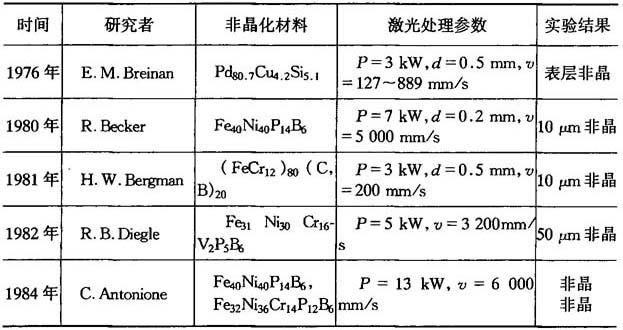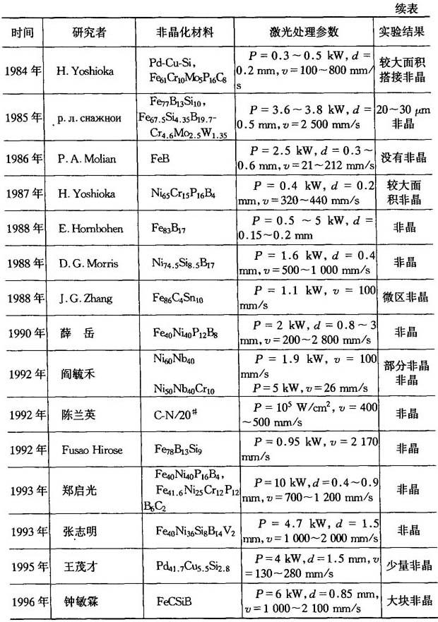 (1)连续激光非晶化的实例 连续激光非晶化的研究实例见表2-18.