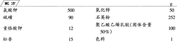 将各种细粉物料依次慢慢加入聚乙酸乙烯胶乳中,充分混合均匀,即成药糊。将干燥的火柴棍,顶端蘸上蜡,然后蘸上药糊,晒干即成火柴。