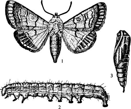 【形态特征】 成虫体长15~18毫米,前翅黄褐色,内横线双线,褐色,波浪形;外横线双线,褐色。内侧1线末端达肾状纹正下方;亚外缘呈锯齿形,在第二中脉处内弯。环状纹近圆形,黄褐色,其中央有1褐色圆斑;肾状纹为褐色圈,圈中有1大型褐斑。后翅黄褐色,外缘有褐色带,其内侧中部较向内凹,有黄褐色锯齿形纹。卵扁球形,高小于宽,乳黄色,长0.4~0.5毫米。卵孔明显,卵壳上有网状纹,纵棱长短相间,为双序形(图5-41)。老熟幼虫体长30~35毫米。头部黄色,具不规则的网状斑。气门片褐色,体上小刺呈圆锥状小点。从头到尾有褐色、白色、深绿色,宽窄不一的条纹。蛹长15~18毫米,黄绿色。腹末2根臀刺基部较相近,臀刺尖端略弯。