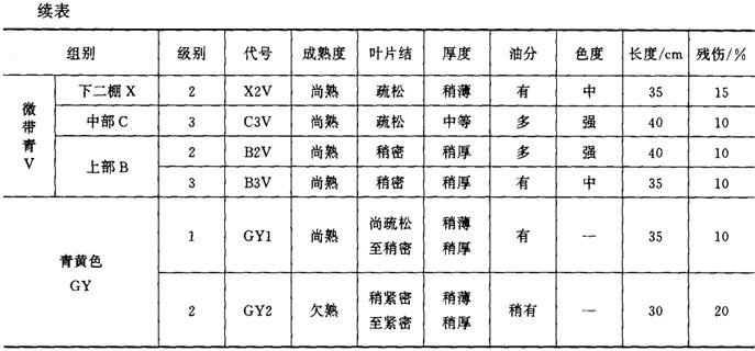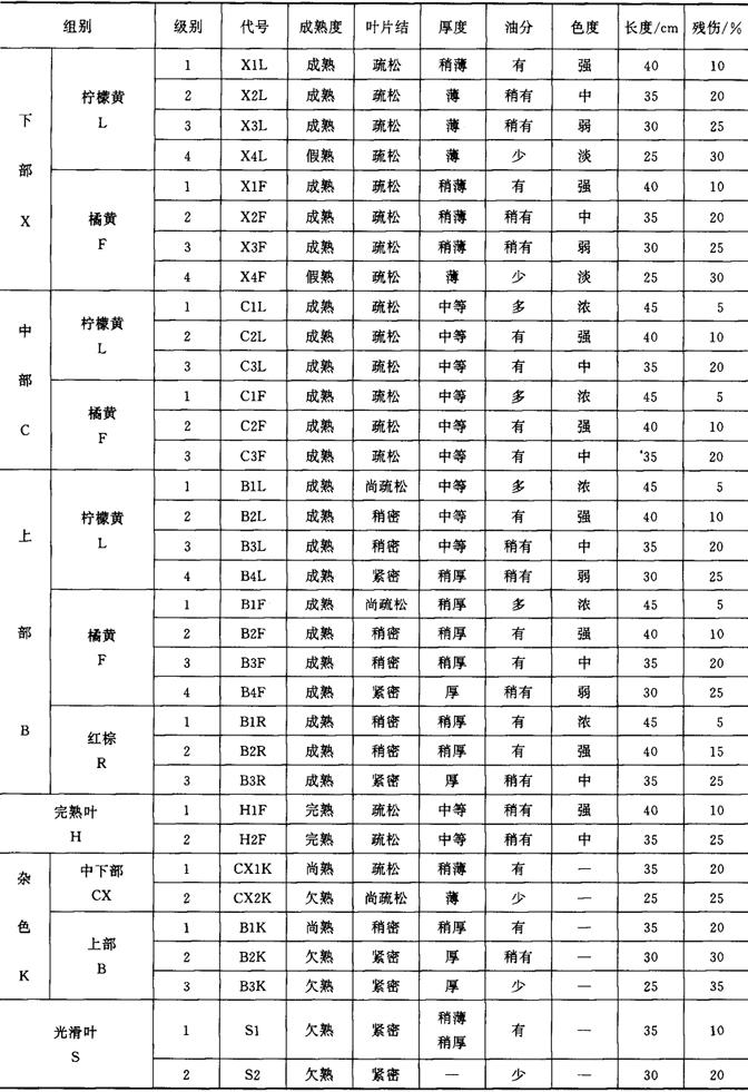 | 释义 | 烤烟的检验 (一)取样 1.现场检验取样 (1)取样数量:每批(指同一地区,同一级别烤烟)在100件以内者取10%~20%的样件,超出100件的部分取5%~10%的样件。必要时酌情增加取样比例。 (2)成件取样:自每件中心向其四周抽检样5~7处,约3~5kg。 (3)未成件取样:可全部作为检验的试样,或按部位抽检样6~9处,约3~5kg或30~50把进行检验。 2.品质检验取样 取样数量为5~10kg,从现场检验打开的全部样件中平均抽取,每样件至少抽样2把。如检验打开的样件超过40件,只需任选40件。 3.含水率检验取样 取样数量不少于0.5kg,从现场检验打开的全部样件中平均抽取。如现场检验打开的样件超过10件,则超过部分,每2~3件任选1件。每样件的取样部位,从开口一面的一条对角线上,等距离抽出2~5处,每处各1把,从每把中任取半把,放入密闭的容器中,检验时从每半把中选择完整叶2~3片。 4.沙土检验取样 取样数量不少于1kg,从现场检验打开的全部样件中平均抽取。如现场检验打开的样件超过10件,则任选10件作为取样对象,每件任取1把。如有异议时,可酌情增加。 5.熄火烟检验取样 取样数量为每件抽取5处,每处任取2把,每把任取1片。从现场检验打开的全部样件中平均抽取。未成件的烟叶,按每50kg均匀取10把,每把1片共10片。不足50kg者仍取10把,每把1片。 (二)品质检验 (1)品质检验以感官检验为主,按品质规定(表8-1-1)逐项检验。 表8-1-1 烤烟的品质规定
