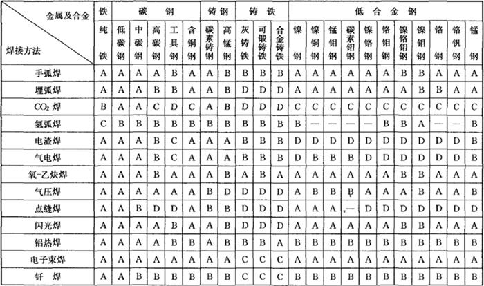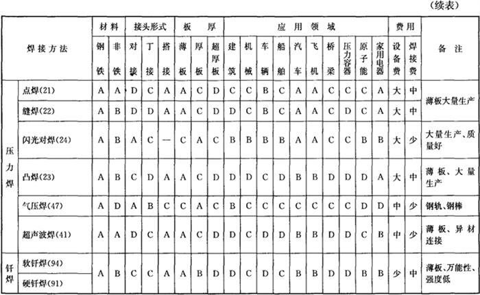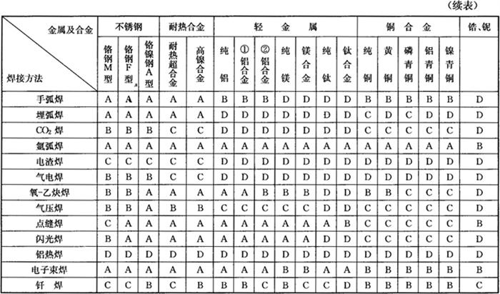 注:A——最适用,B——适用,C——稍适用;D——不适用;薄板<3mm,厚板3~50mm,超厚板>50mm。括弧中的数字为该方法在图样上的表示代号(GB5185-1985)。 4.常用金属推荐焊接方法(见表7-6) 表7-6 常用金属材料推荐的适用焊接方法