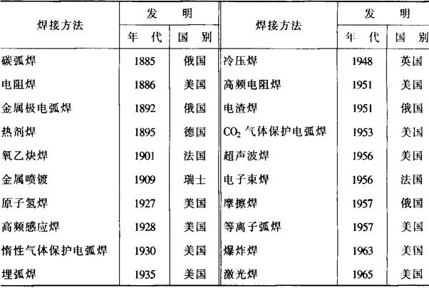 释义 | 焊接的发展简史 焊接是一种古老的加工方法,已有上千年的历史,据有关资料介绍,出土的秦代兵马俑铜马车是由许多块焊成的。有记载的焊接方法、软钎焊和锻焊至少也有数百年的历史。但用于现代工业生产的焊接方法,多数还是19世纪初发现电弧,特别是1885年俄罗斯人别那尔道斯(Бeнардо)发明碳弧焊之后出现的。工业技术的进步,新材料、新能源的出现,推动了焊接技术的发展。从发现电弧到激光能源出现的一百多年的时间里,发明了二十余种基本焊接方法,加上其衍生的方法不下百余种。各种基本方法的发明年代见表1-1。1892年发明金属极电弧焊,到1930年左右采用薄药皮焊条,得到稳定的金属熔化极焊接电弧之后,才逐渐扩大了它的实际应用。为了加强保护、改善冶金反应、提高生产率等目的研制了各种厚药皮焊条、特种焊条、有色金属焊条等。1935年埋弧焊发明之后,相继研制了不同用途的钢焊丝、合金钢焊丝、药芯焊丝等,大大提高了生产效率和焊接的应用范围。为满足不同焊接方法的需要,设计研制了各种相应的焊机,弧焊机的重要组成部分弧焊电源得到不断的发展,由交流弧焊变压器、直流弧焊发电机,发展到各种整流弧焊电源、脉冲弧焊电源、矩形波弧焊电源和逆变弧焊电源。为提高生产率和焊接质量、改善劳动条件,机械化、自动化设备,如埋弧自动机、电渣焊机、气保护自动焊机、节能焊机等大量出现了,焊接辅助装置翻转机、变位机等也广泛应用并系列化生产。先进的控制技术不断引入焊接行业,数控焊接与切割、计算机编程控制的切割与焊接,以及焊接机器人等先进技术得到广泛应用。为确保质量和重复性良好的规模生产,焊接设备、工艺、材料、质量标准化、系列化工作得到快速发展,受到普遍重视。质量检验的方法和设备发展相当迅速。金相组织、机械性能、内部缺陷检验手段发展甚快,X、γ射线、超声波探伤、磁力探伤等已能查出不同厚度焊缝内部的微小缺陷。 表1-1 各种基本焊接方法的发明年代和国别 |