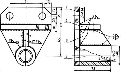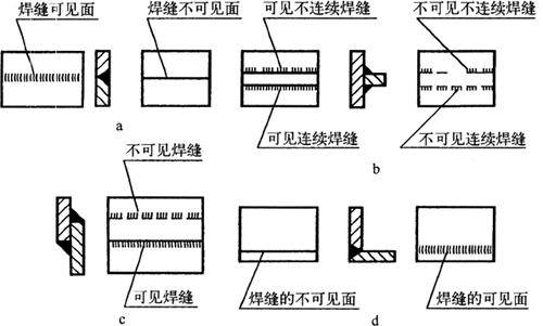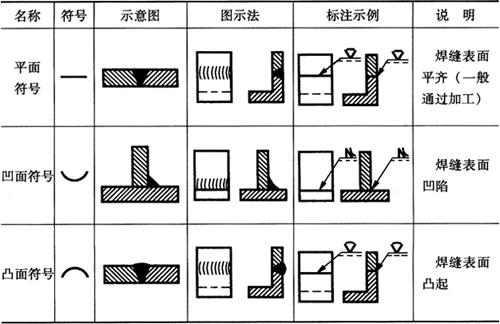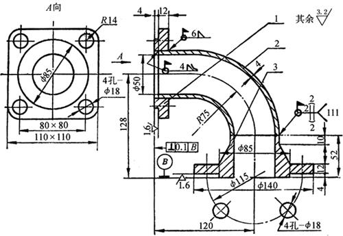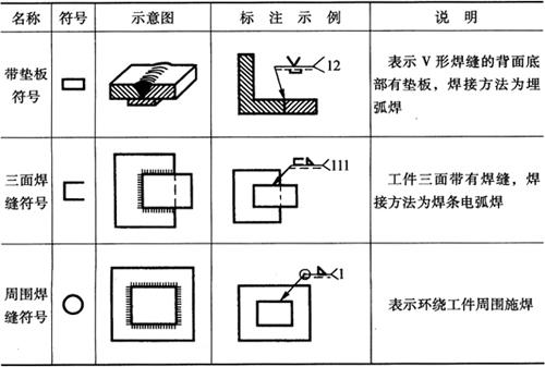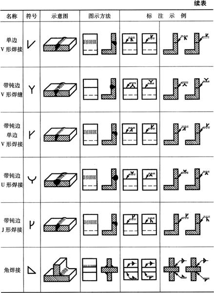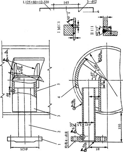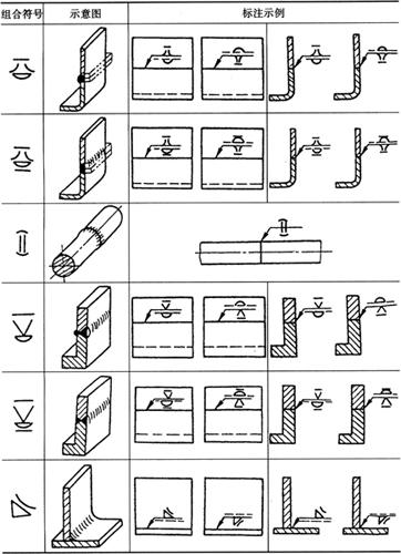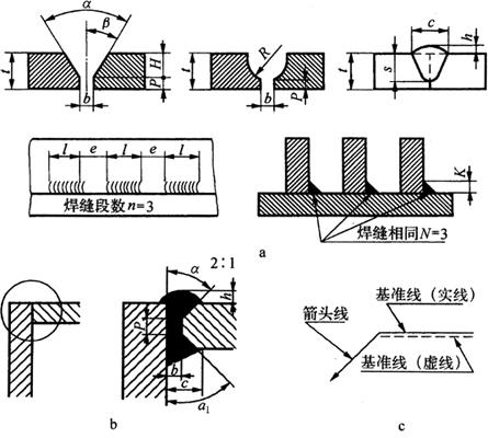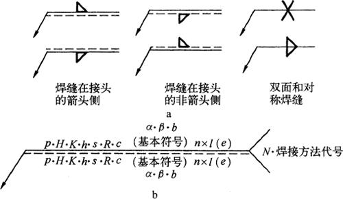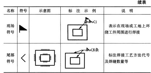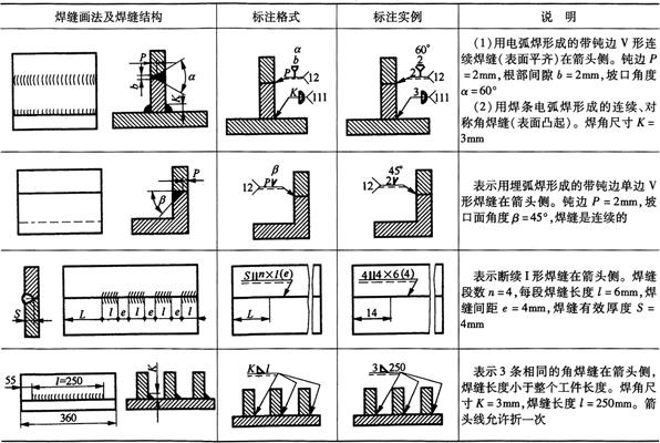 释义 | 焊接结构图 (一)焊接方法的表达及代号 1.焊接方法的代号 按照GB5185-85《金属焊接及钎焊方法在图样上的表示代号》的规定,用阿拉伯数字代号表示各种焊接方法,并可在图样上标出,常用焊接方法及代号见表4-14。 表4-14 常用焊接方法代号(摘自GB5185-85) 2.焊接方法的表达 图4-14表示用焊条电弧焊焊成的挂架焊接方法,焊角为5mm的角焊缝。 图4-14 挂架焊接方法标注(单位:mm) 1.侧板 2.上平板 3.肋板 4.圆筒 当一张图纸上全部焊缝采用同一种焊接方法时,焊缝代号中的焊接方法代号可以省略,但必须在技术条件或其他技术文件中注上“全部焊缝均采用××焊”;当大部分焊接方法相同时,可在技术条件或其他技术文件中注明“除已注明焊缝的焊接方法外,其余均采用××焊”等字样。 (二)焊缝的表达及符号 1.焊缝的图示法 焊缝是焊件经焊接后在焊接接头处所形成的结合部分,焊缝形式主要有对接焊缝和角焊缝等,焊接接头形式主要有对接、T形接、角接及搭接接头等,如图4-15所示。 图4-15 焊缝形式及画法 a.对接焊缝及画法 b.T形接焊缝及画法 c.搭接焊缝及画法 d.角接焊缝及画法 在技术图样中,一般按照GB/T324-88规定的焊缝画法,简易绘制焊缝可用视图、剖视图、剖面图或轴测图示意表示。在视图中焊缝用一系列细实线段表示,也可用特粗线表示,但同一图样中只允许采用一种画法。在剖视图或剖面图中,金属的焊缝断面需涂黑,这是焊缝的规定画法。 2.焊缝的符号表示方法 焊缝符号一般由基本符号与指引线组成,必要时还可以加上辅助符号、补充符号和焊缝尺寸符号。 (1)基本符号:是表示焊缝横截面形状(图4-16b)的符号,如表4-15所示。 图4-16 焊缝尺寸及标注符号 a.焊缝尺寸符号 b.焊缝放大图 c.指引线符号 表4-15 焊缝基本符号及标注方法(摘自GB/T324-88) (2)辅助符号:是表示焊缝表面形状特征的符号(表4-16),不需要确切地说明焊缝的表面形状时,可以不用辅助符号。 表4-16 焊缝辅助符号及标注方法(摘自GB/T324-88) (3)补充符号:是为了补充说明焊缝的某些特征而采用的符号,如表4-17所示。 表4-17 焊缝补充符号及标注方法(摘自GB/T324-88) (4)焊缝尺寸符号:是用字母代表焊缝的尺寸要求,是基本符号必要时可附带的尺寸符号及数据,如图4-16a所示,GB/T12212-90规定如表4-18所示。 表4-18 焊缝尺寸符号(摘自GB/T12212-90) (5)指引线符号:指引线由带箭头的箭头线和基准线两部分组成,如图4-16c所示。基准线由两条相互平行的细实线和虚线组成,且一般与标题栏的长边相平行,必要时也可与标题栏的长边相垂直。 箭头线用细实线绘制,箭头指向有关焊缝处,必要时允许箭头线弯折一次,当需要说明焊接方法时,可在基准线末端增加尾部符号(表4-17)。 (三)焊缝的标注方法 1.基本符号的标注(表4-15) 例如V形焊缝,若焊缝在接头的箭头侧,则将基本符号标在基准线的实线一侧;若焊缝在接头的非箭头侧,则将基本符号标在基准线的虚线一侧(表4-19中第四图例等)。 表4-19 基本符号与辅助符号组合的标注方法(摘自GB/T324-88) 2.基本符号与辅助符号组合的标注 基本符号与辅助符号组合的标注见表4-19。 3.焊缝简化标注(表4-20) 由于焊缝图示方法和非简化标注,相对比较复杂,而现场施工部门对经常施工图样比较熟悉。为提高设计效率,焊缝可允许简化标注。如图4-17a中第三图示的对称焊缝的简化标注法为“ 表4-20 焊缝简化标注(摘自GB/T12212--90) 图4-17 焊缝尺寸符号及标注原则 a.基本符号相对基准线的位置 b.焊缝尺寸标注 4.焊缝尺寸符号及数据的标注 焊缝尺寸符号及数据的标注原则如图4-17b所示。 (1)焊缝横截面上的尺寸数据标在基本符号的左侧。 (2)焊缝长度方向的尺寸数据标在基本符号的右侧。 (3)坡口角度、坡口面角度、根部间隙等尺寸数据标在基本符号的上侧或下侧。 (4)相同焊缝数量及焊接方法代号标在尾部。 (5)若需标注尺寸数据较多又不易分辨时,可在数据前面增加相应的尺寸符号。 焊缝位置的尺寸不在焊缝符号中标出,而是标注在图样上(图4-17a)。在基本符号右侧既无任何标注又无其他说明时,意味着焊缝在工件的整个长度上是连续的;在基本符号左侧既无任何标注又无其他说明时,表示对接焊缝要完全焊透。 5.焊缝画法及标注综合实例 焊缝画法及标注综合实例如表4-21所示。 表4-21 焊缝画法及标注综合实例 (四)焊接结构图绘制 焊接图是表示焊接部件或焊接结构的工程图样。它除了一般工程图样应具有的基本内容外,还必须根据焊接标准,在图中加以必要的标注或说明。按照焊接件结构的复杂程度不同,可有以下两种画法。 1.整体式画法 这种画法的特点是图上不仅表达了各零件的装配、焊接要求,而且还必须表达其他加工所需要的全部内容,这种图要求把零件或构件的全部结构形状、尺寸和技术要求都表达得完整、清晰。因此,表达内容和零件图基本相同,一般不必再画零件图。图4-18所示为两端装焊法兰盘和底盘弯管头的整体式焊接图。 图4-18 弯管头的整体式焊接(单位:mm) 1.法兰盘 2.弯管 3.底盘 图4-18弯管头为化工设备上的一个焊接件,由法兰盘、弯管和底盘三个零件组成,其材料均为Q235A。法兰盘和弯管的内焊缝代号为”,其中“ 2.组合式画法 这种画法的特点是图上只着重表达装配连接关系、焊缝要求等,而其中每一零件或构件需另画零件图表示,即焊接图相当于一张组件装配图,零件图补充