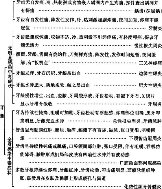 释义 | 牙痛 牙痛是十分常见的症状。牙痛绝大多数是由于牙齿疾病中龋齿和牙周疾病引起的,其中以龋齿的继发病牙髓炎和根尖周围炎最为普遍。除牙源性感染外,亦有因其他疾病引起牙痛症状的,如三叉神经痛、上颌窦炎引起的牙痛,或颌骨骨髓炎、颌骨肿痛所致的牙痛。以上牙痛具有各自的特点,可参阅以下牙痛诊断思路: 【诊断思路】 |